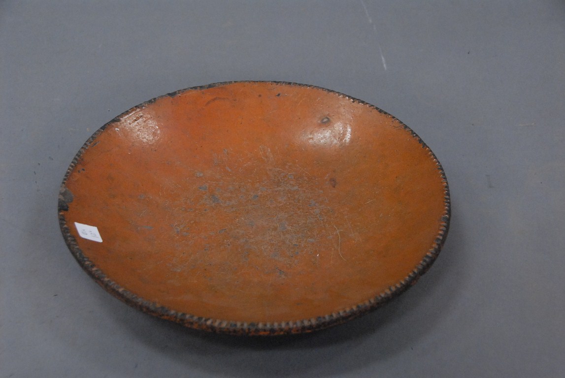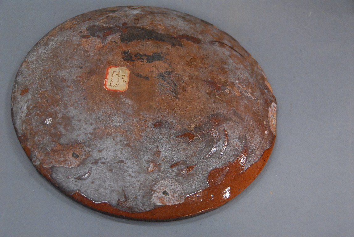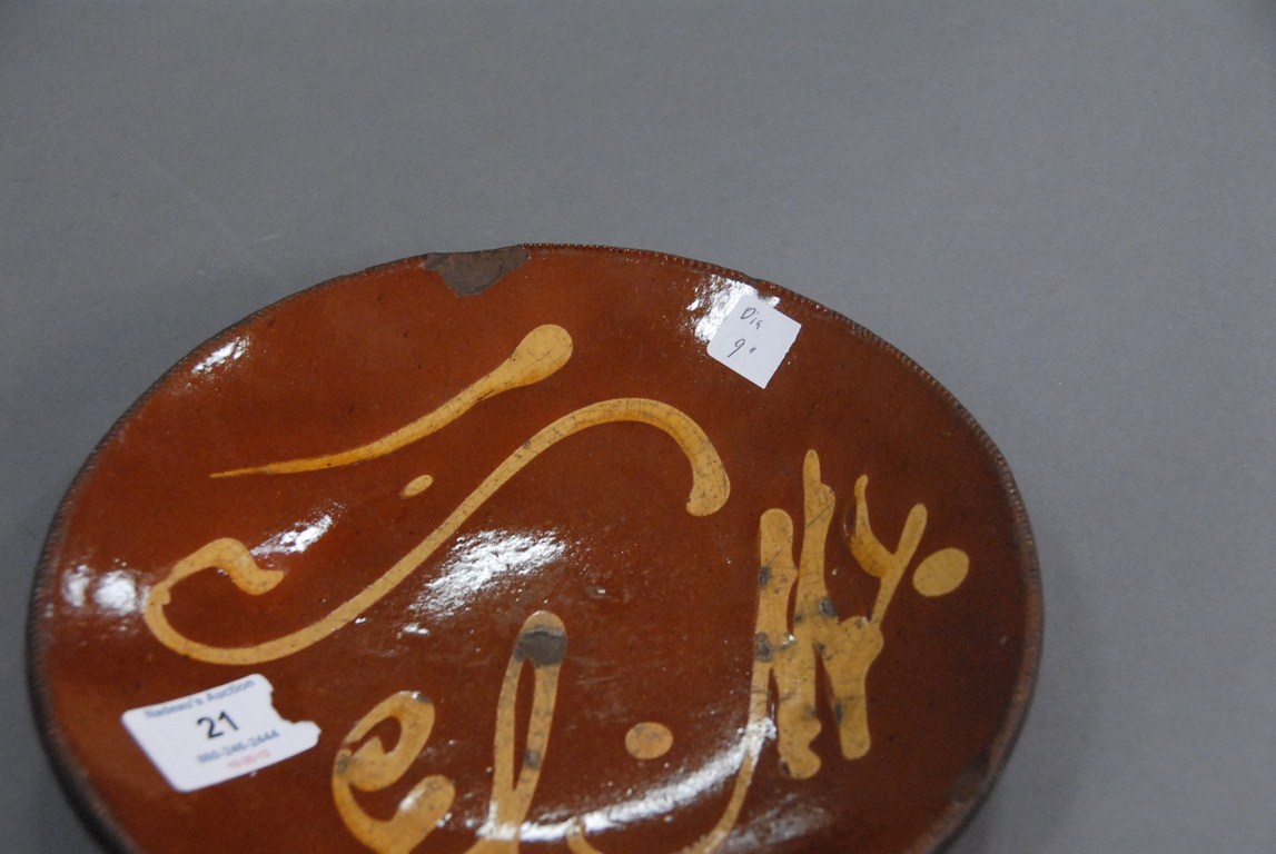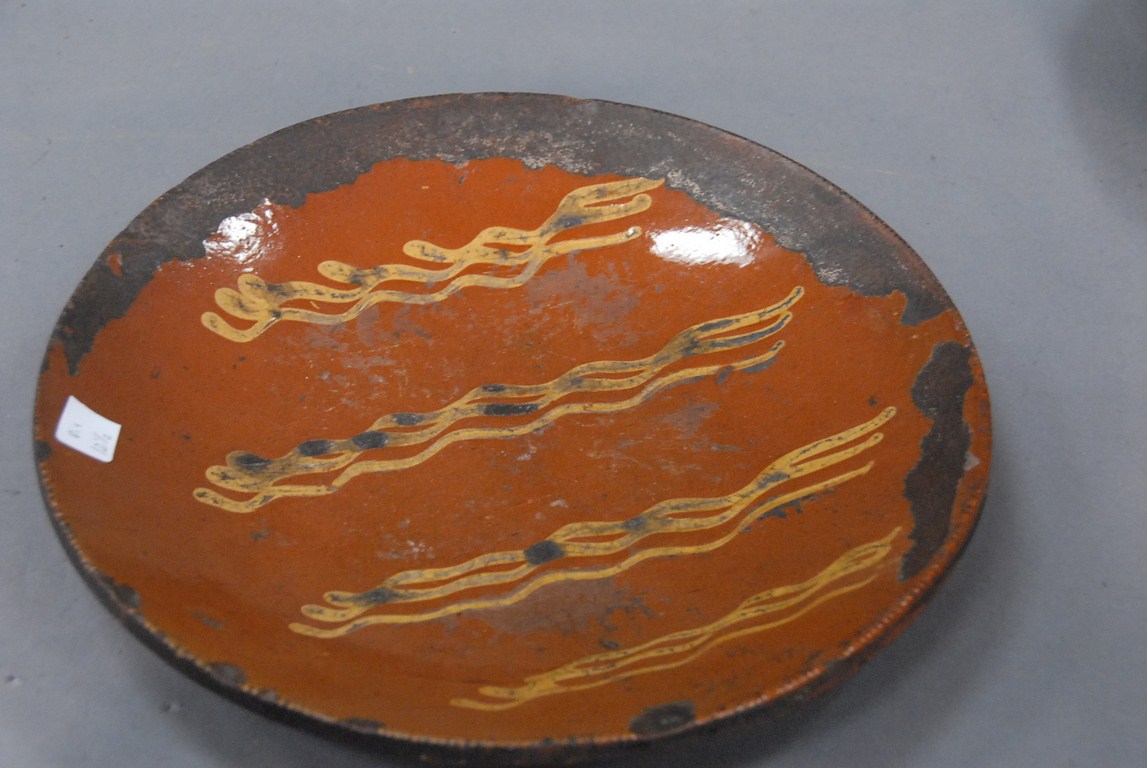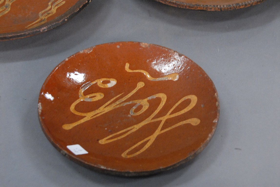 Lot 21: Four piece lot of primitive redware plates, three with slip decoration. 9in. – 12 1/2in. Being sold to benefit a Connecticut Museum.