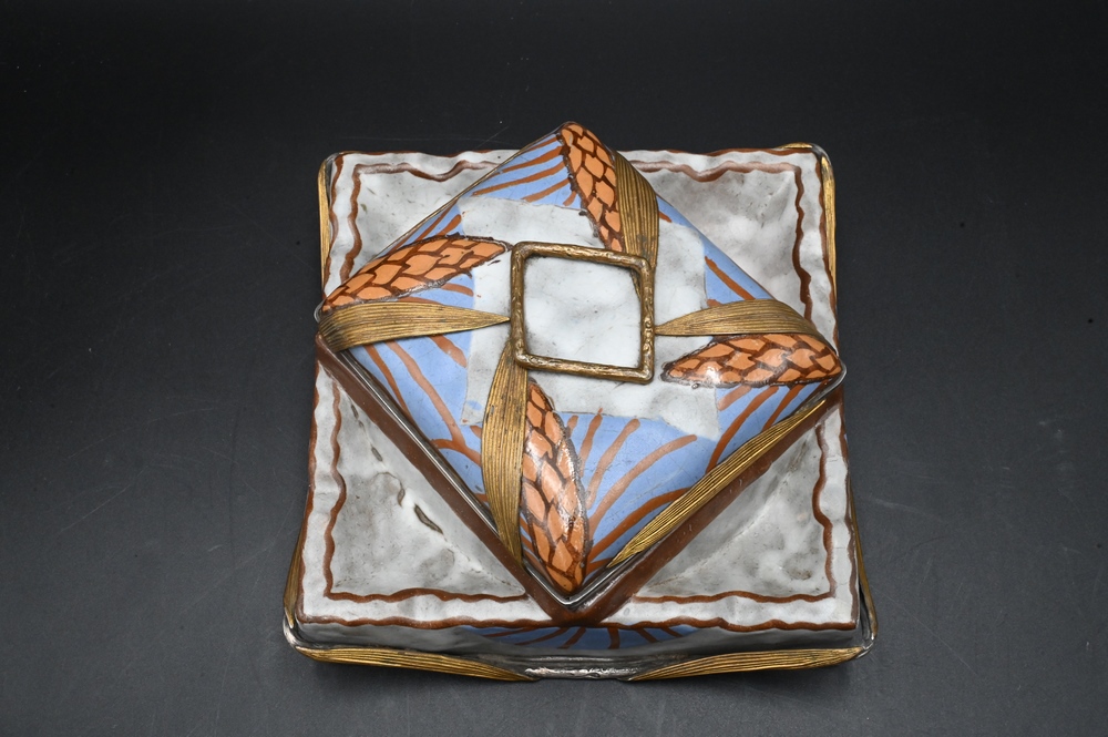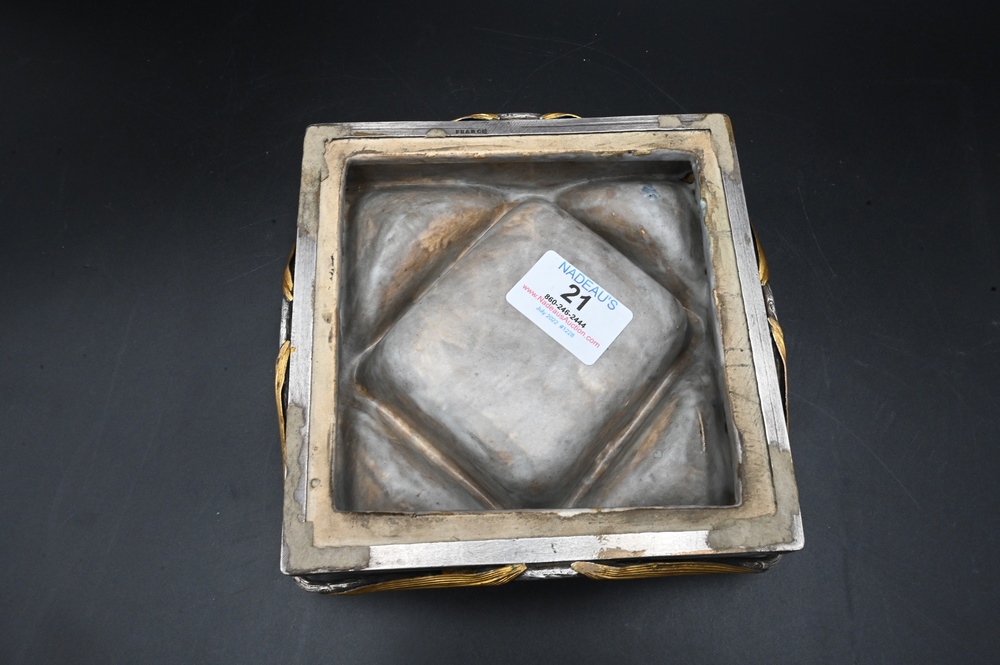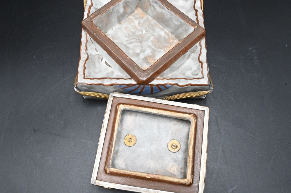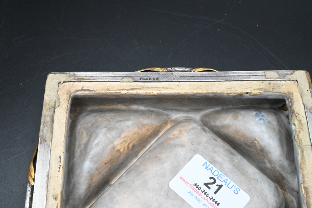 French Art Deco Porcelain Box, having silver frame and mounts, marked France, height 2 1/2 inches.