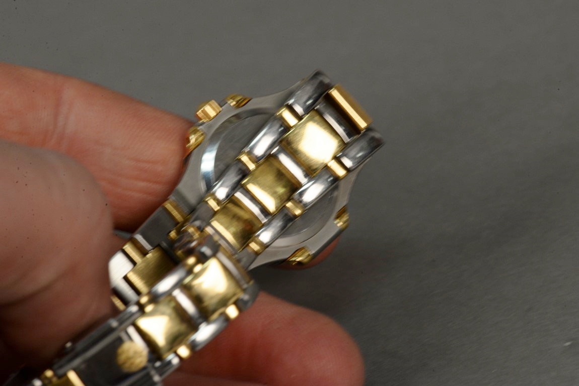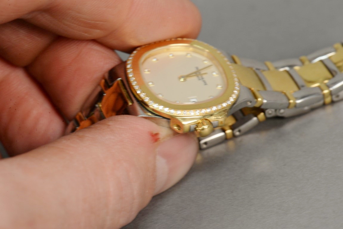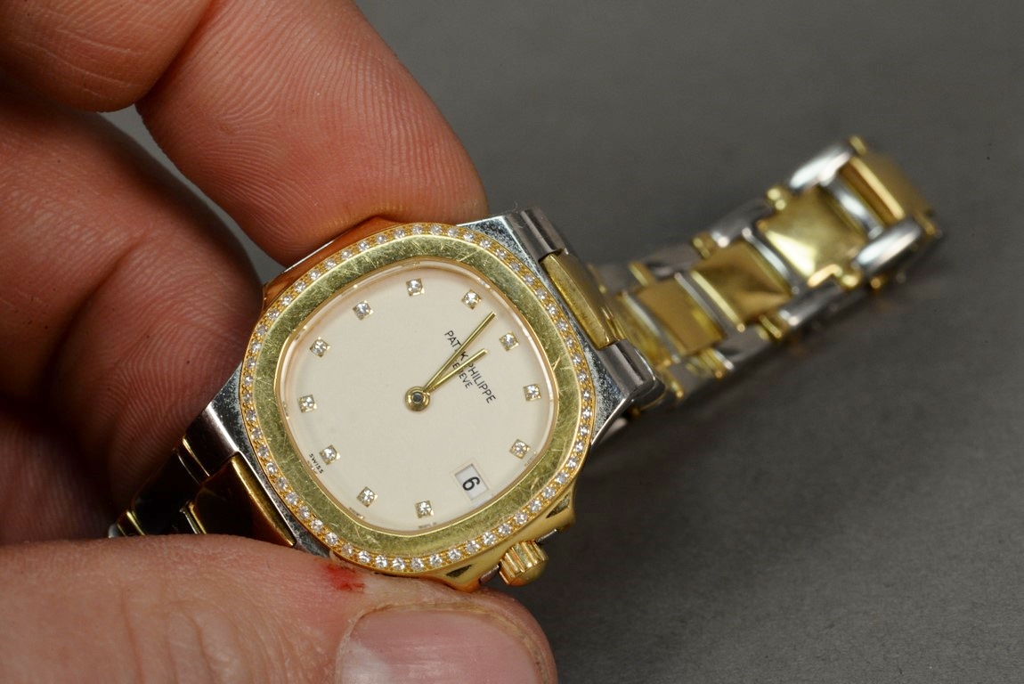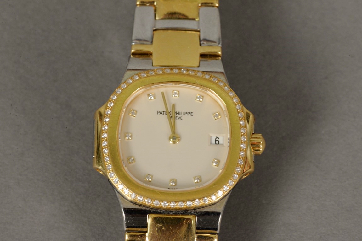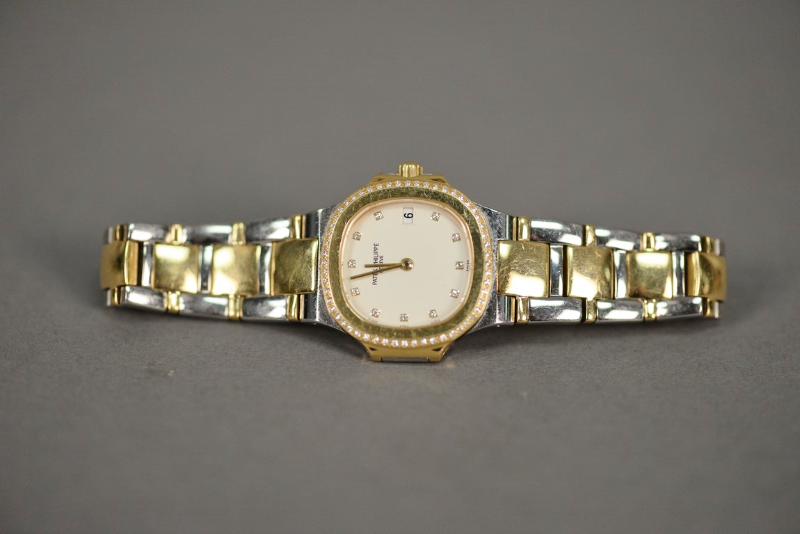 Lot 21: Lady’s Patek Philippe wristwatch, 18K yellow gold and stainless steel, dot date dial, diamond bezel, quartz movement 1539629, case n…