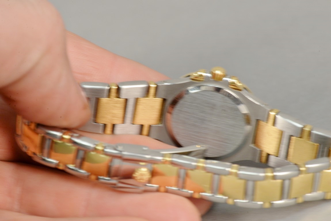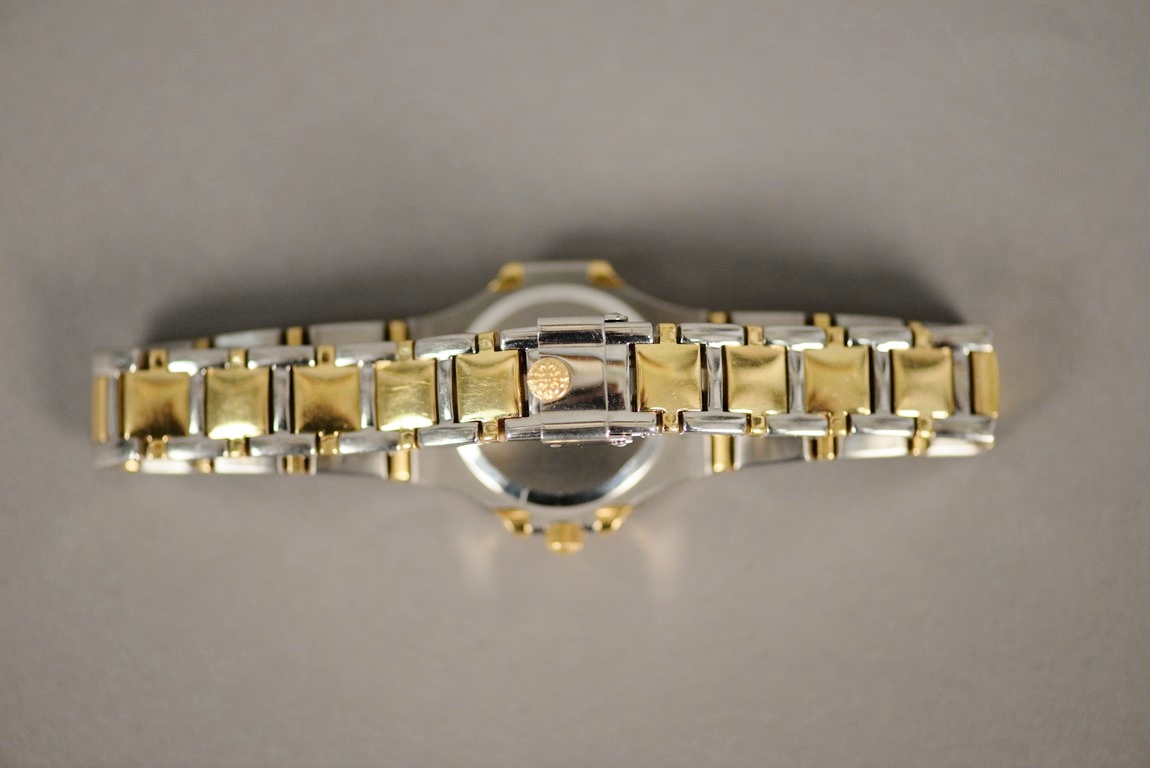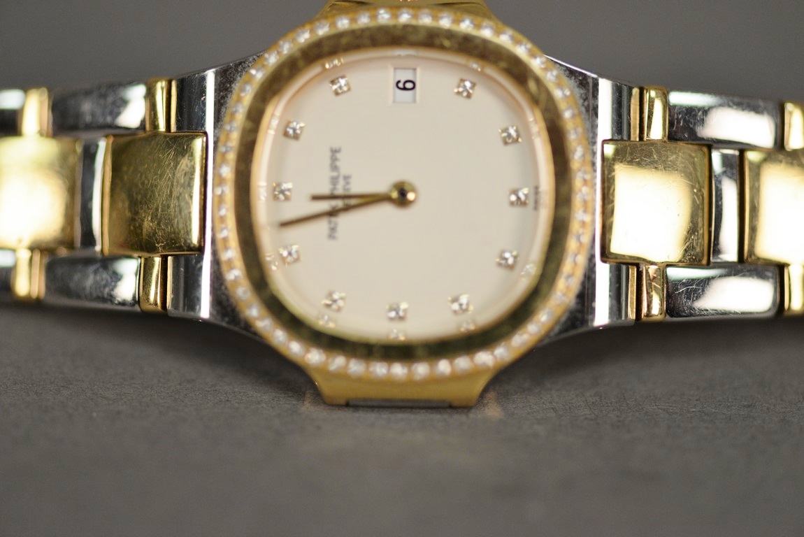 Lady’s Patek Philippe wristwatch, 18K yellow gold and stainless steel, dot date dial, diamond bezel, quartz movement 1539629, case no. 4036622. not working at present.