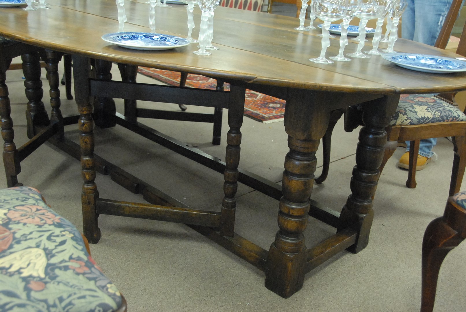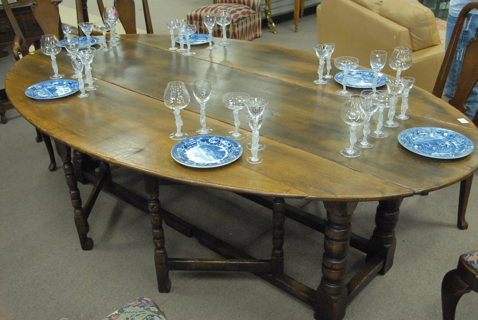 Lot 21: Oak refectory style table with oval drop leaves. ht. 29 in. open: lg. 94 in. wd.58 in.