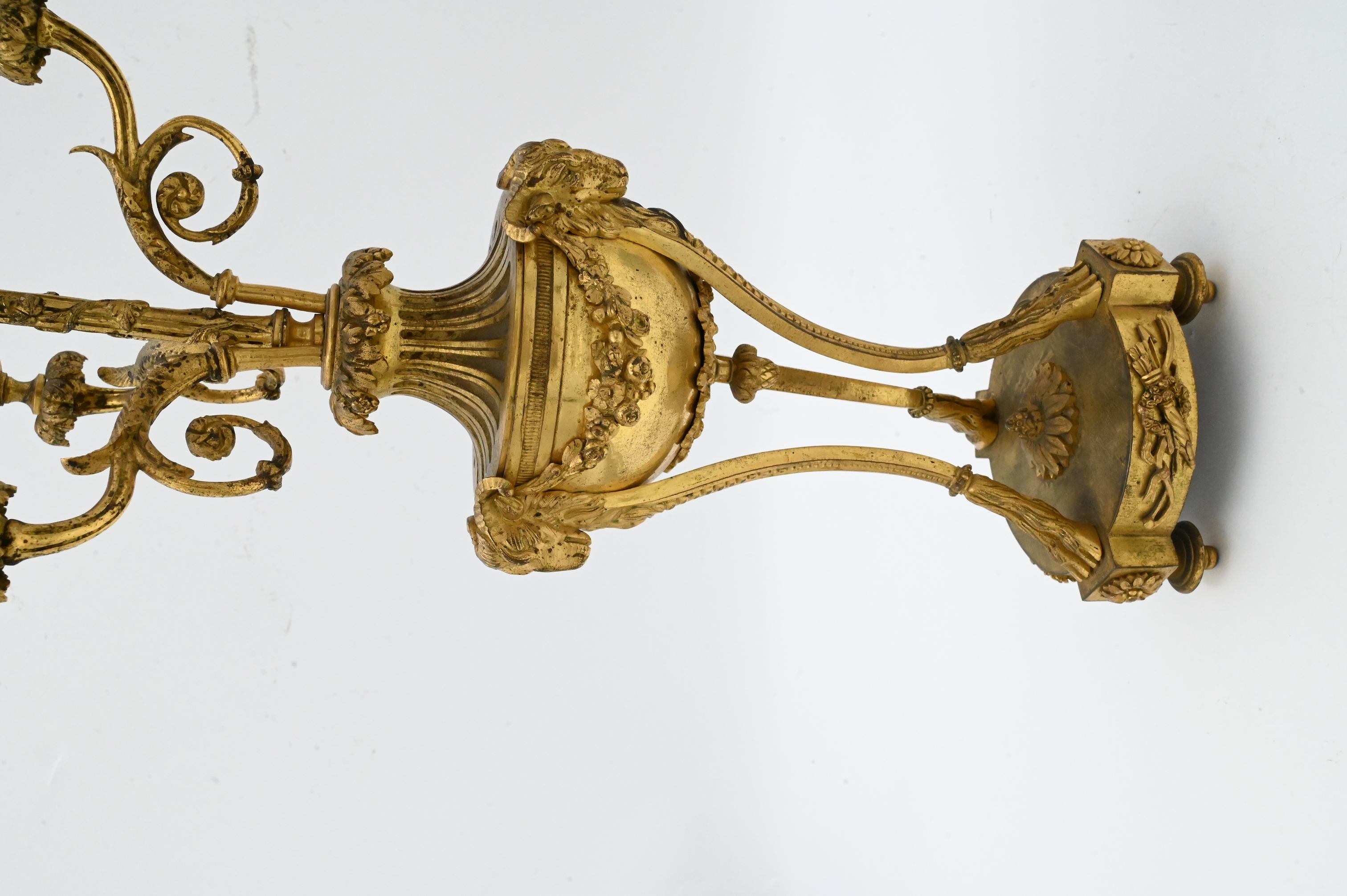 each having four scrolling arms over urn form body with gilt bronze rams head, floral swags all over tripod legs ending in hoof feet, 19th century, one leg in need of repair one as is