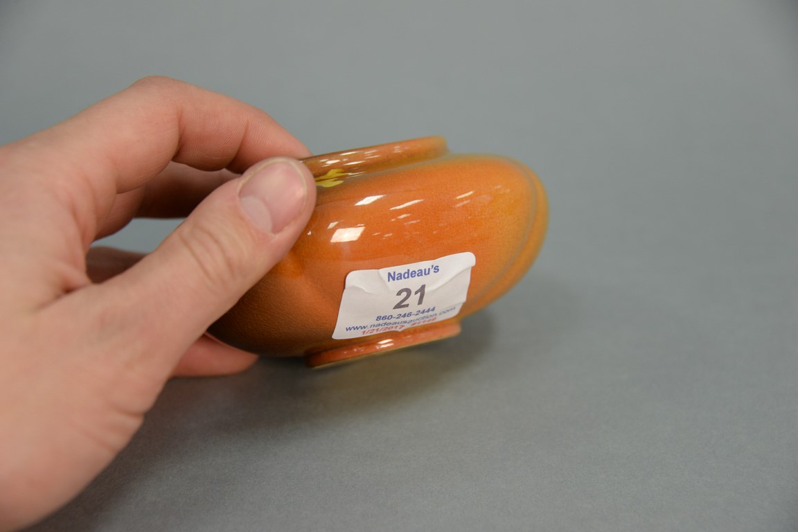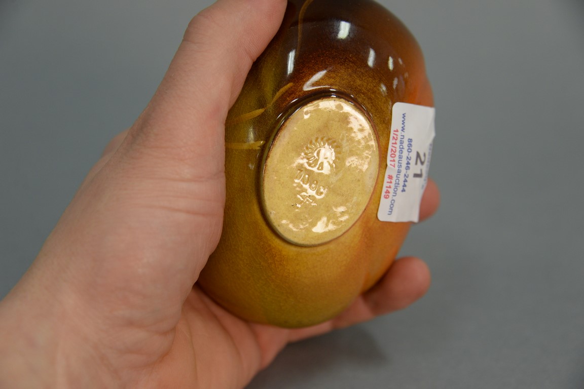 Lot 21: Rookwood glazed vase leaf and vine painted marked for Rookwood on bottom and 708C. ht. 2 1/2in., wd. 4 1/2in.