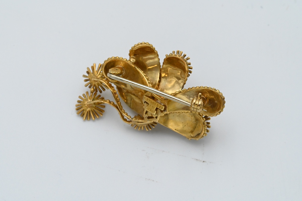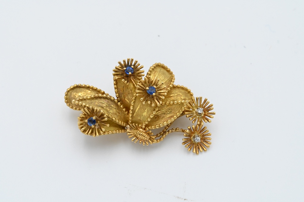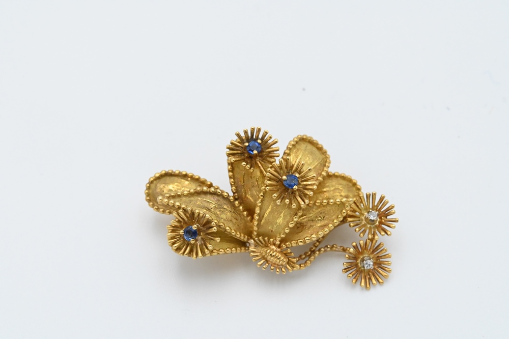 Lot 21: Tiffany & Company 18 Karat Gold Brooch, set with sapphires and two diamonds, length 1 5/8 inches, 12 grams.
