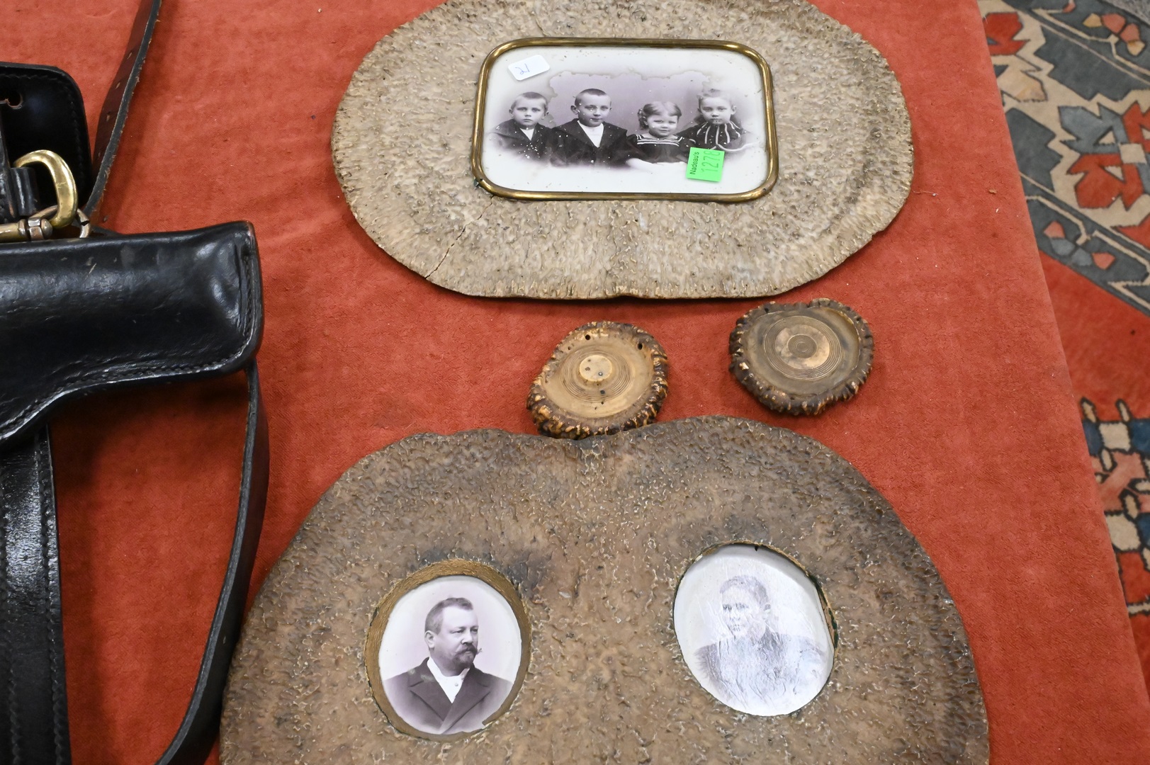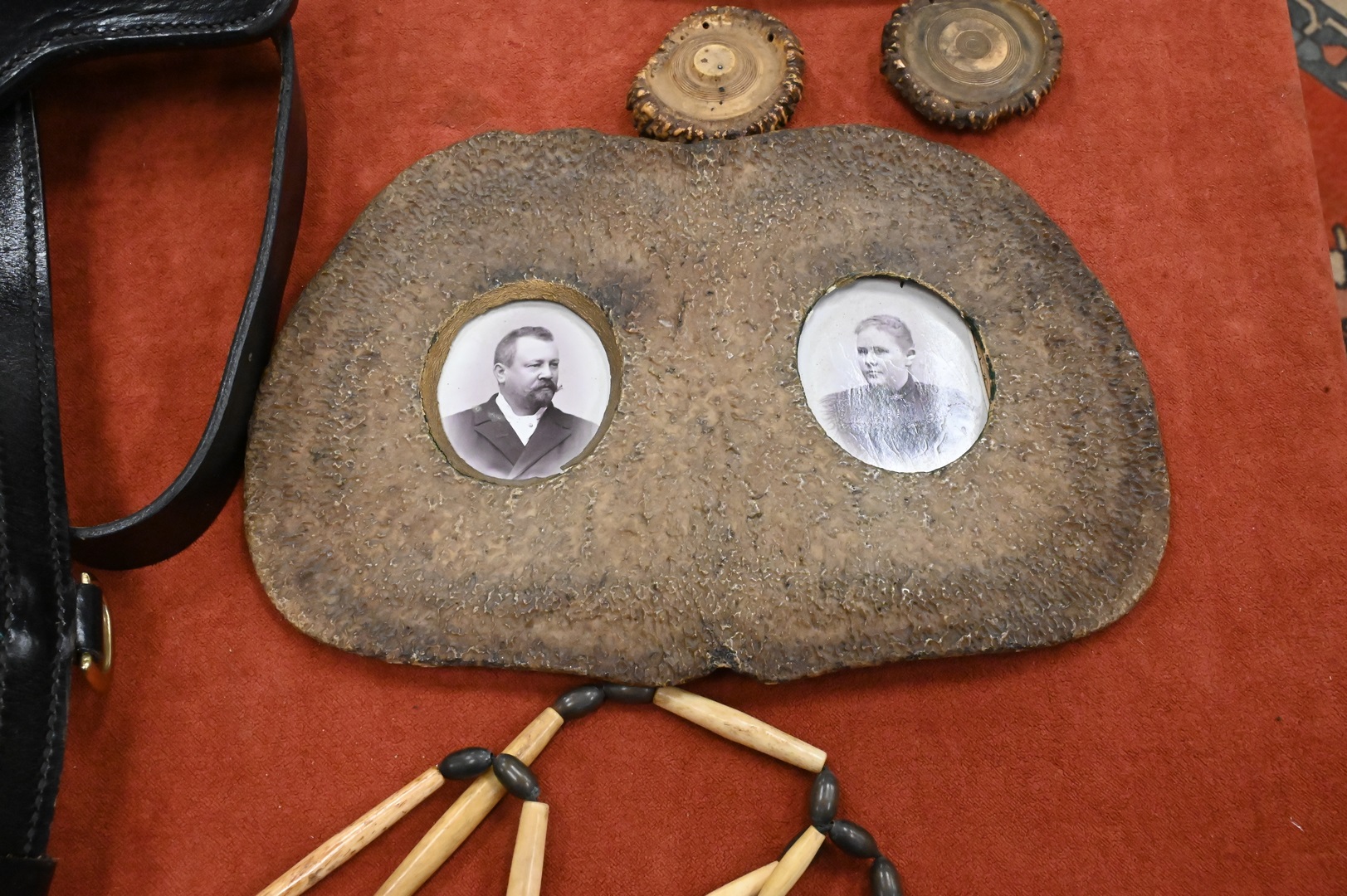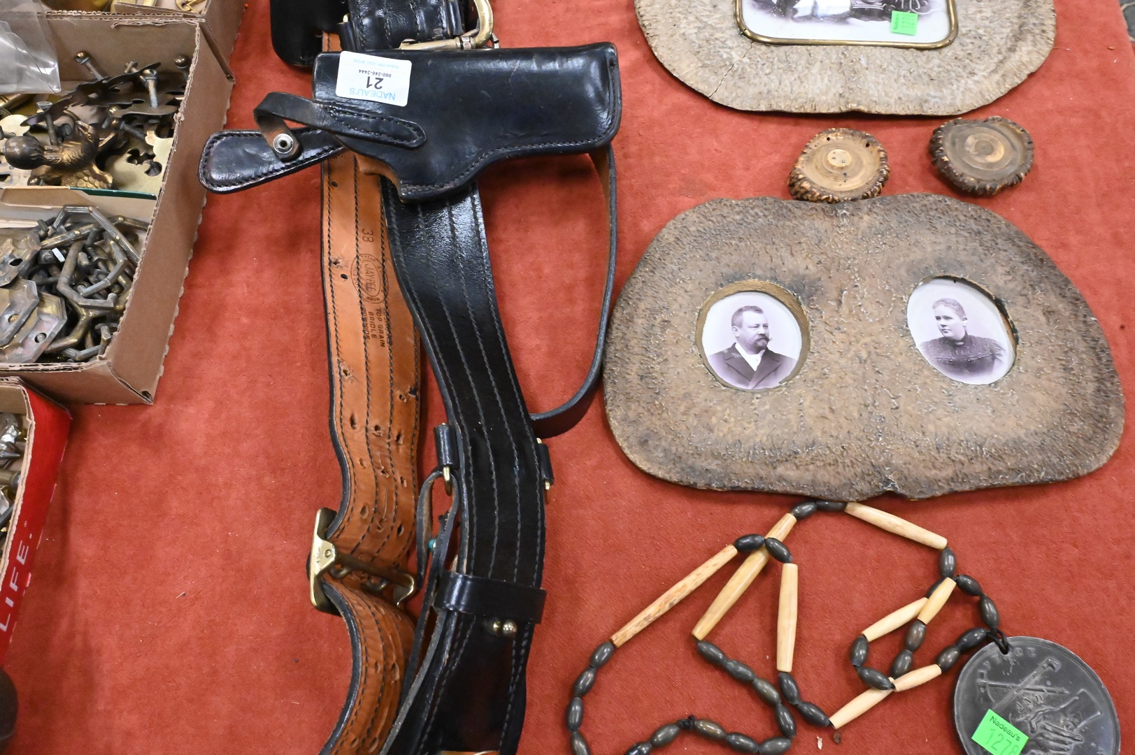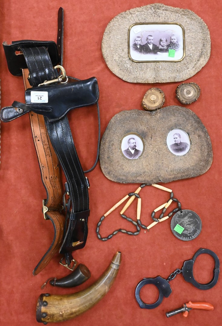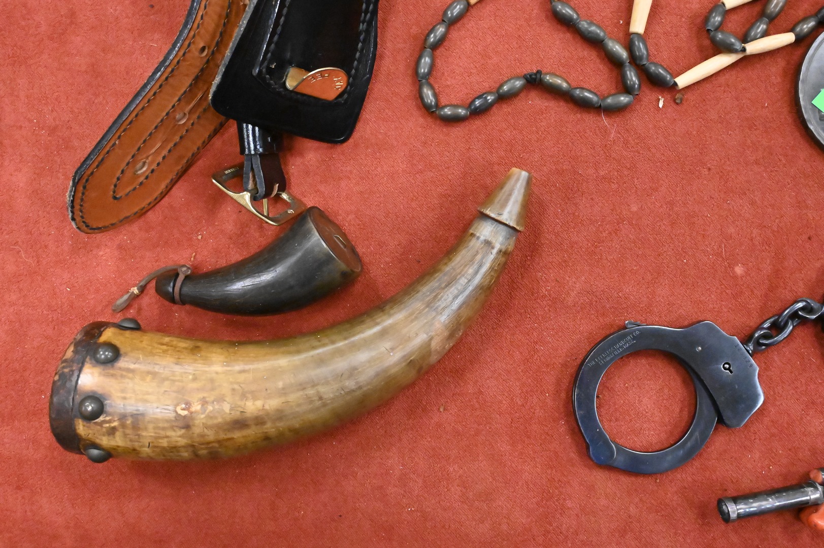 Tray Lot, to include 4″ coral piece, powder horn, specimen frames, leather belt with holster, handcuffs, along with a reproduction George Washington coin on bone necklace, Provenance: Estate of Peter Tillou, Litchfield, Connecticut.