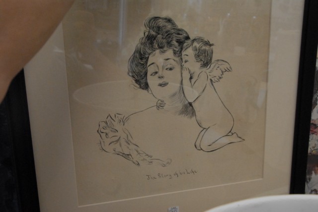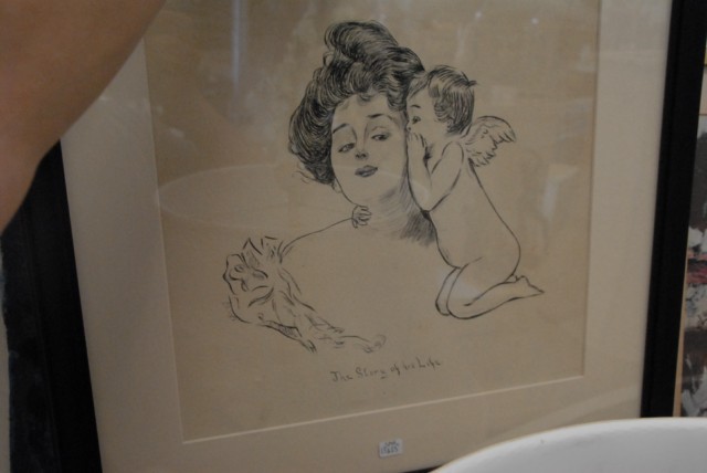 5 pc lot to include an Aubrey Beardsley ink, mixed media, and 3 prints.