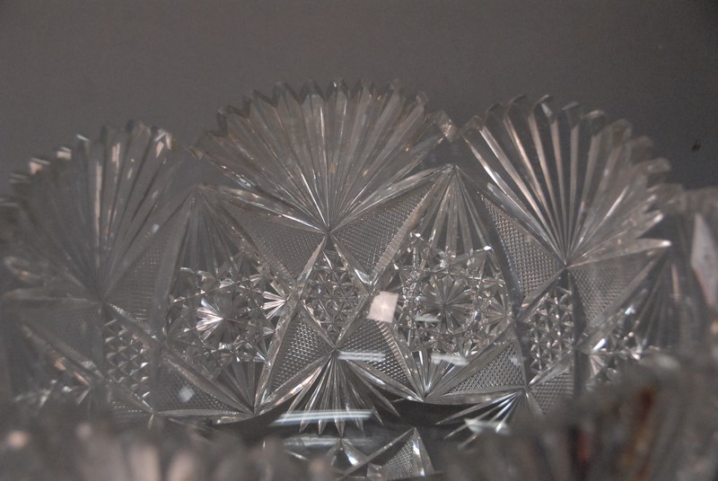 American cut glass punch bowl very minute rough spot on two teeth, fluoresces yellow under black light. dia. 12in.