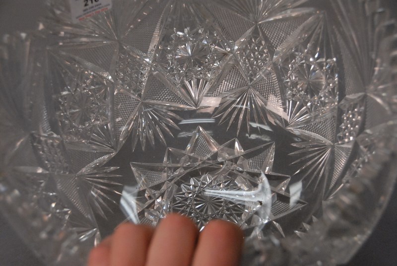 Lot 210: American cut glass punch bowl very minute rough spot on two teeth, fluoresces yellow under black light. dia. 12in.