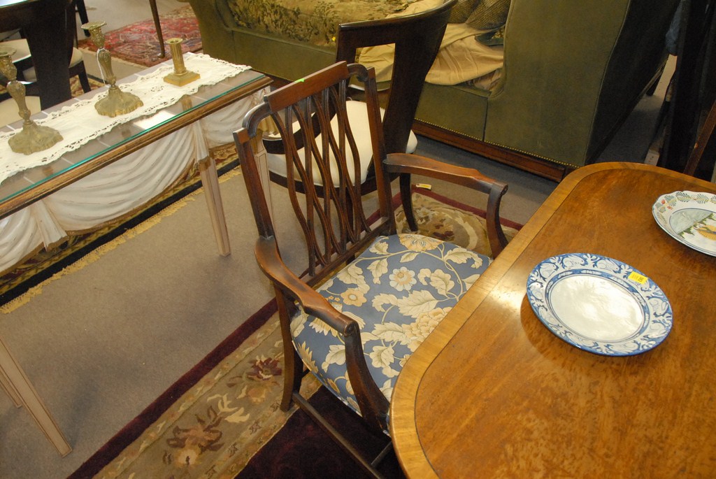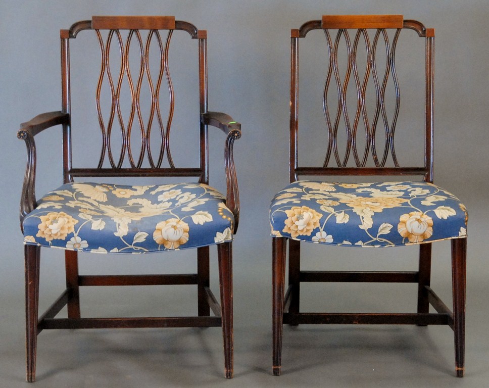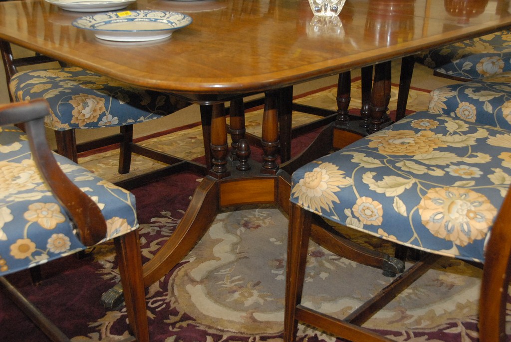 Lot 210: Beacon Hill custom mahogany double pedestal dining table with banded inlaid top and two extra large leaves along with set of eight F…