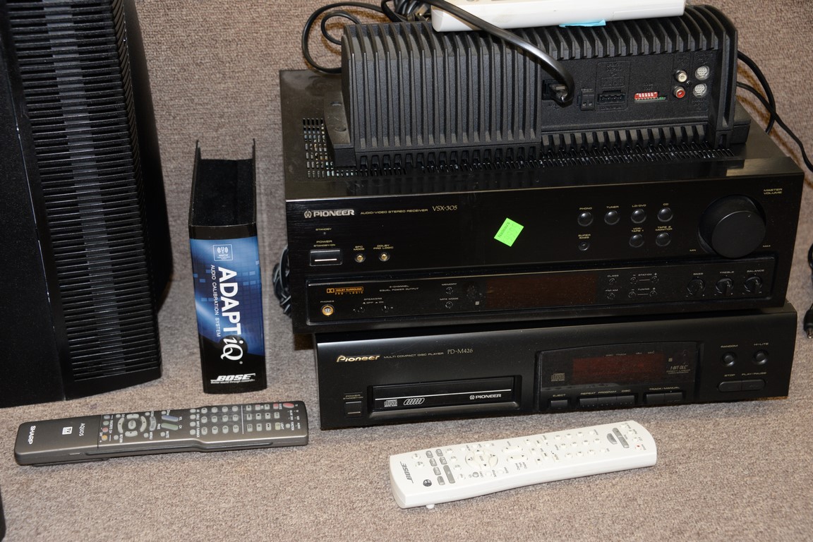 Bose surround sound model AV48 media center with Bos model P548 powered speaker system subwoofer, four double speakers, Lifestyle 5A3 amp along with Pioneer VSX-305 stereo receiver and Pioneer disc player.