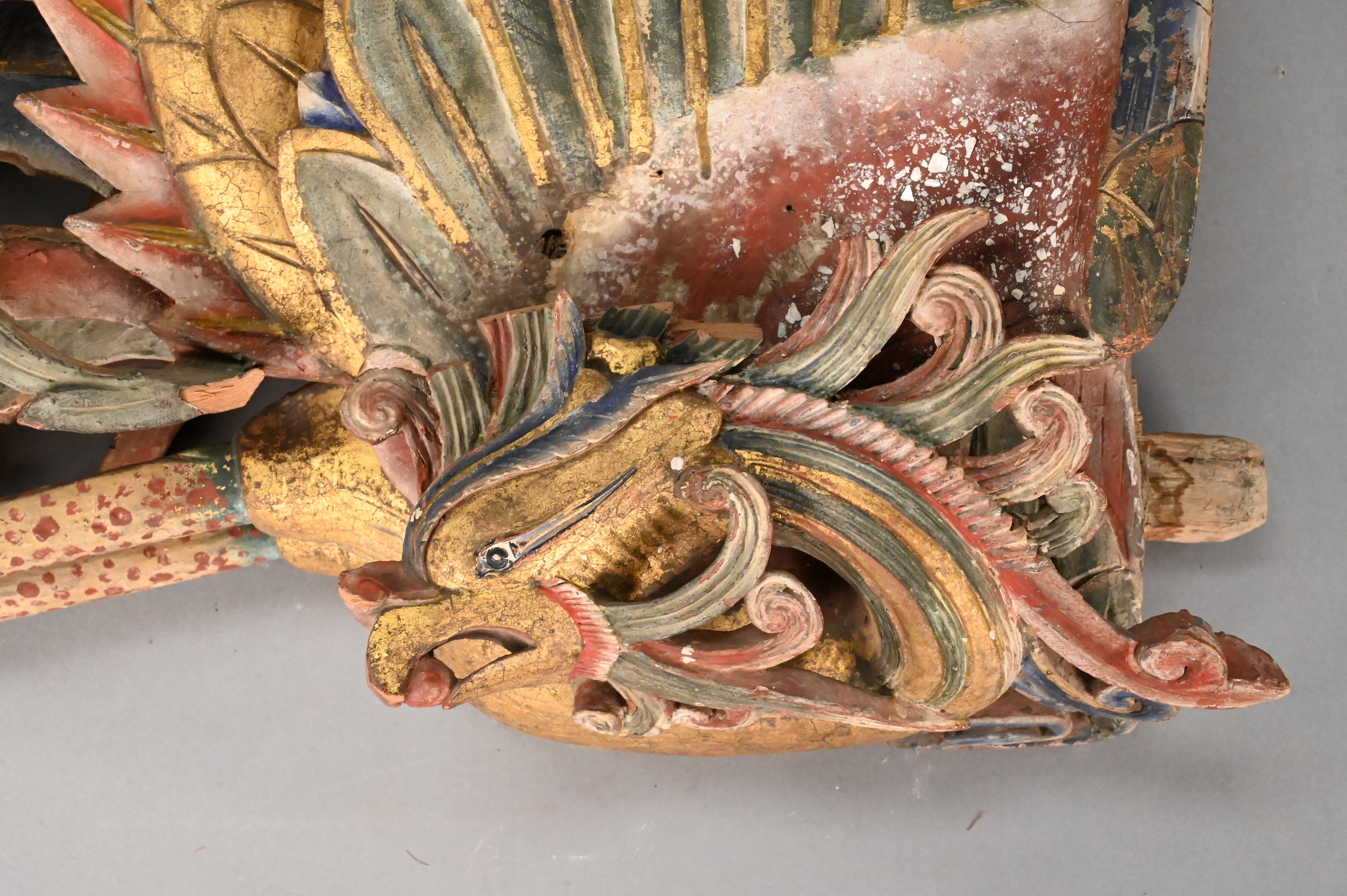 carved and painted camphor wood featuring a phoenix with raised wings and bent neck painted in green, blue, red, and gilt