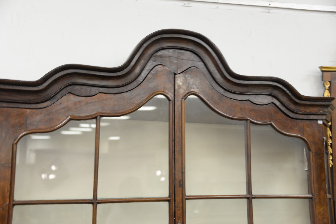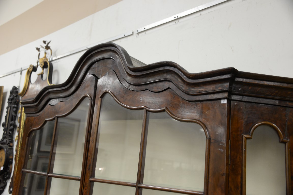 Dutch breakfront in two parts, upper section with arched top, two glazed doors on lower portion having three long drawers set on flared bracket feet, interior with two glass shelves and lights, 18th century, probably Dutch or German, ht. 88 in. wd. 68 in. dp. 15 in.