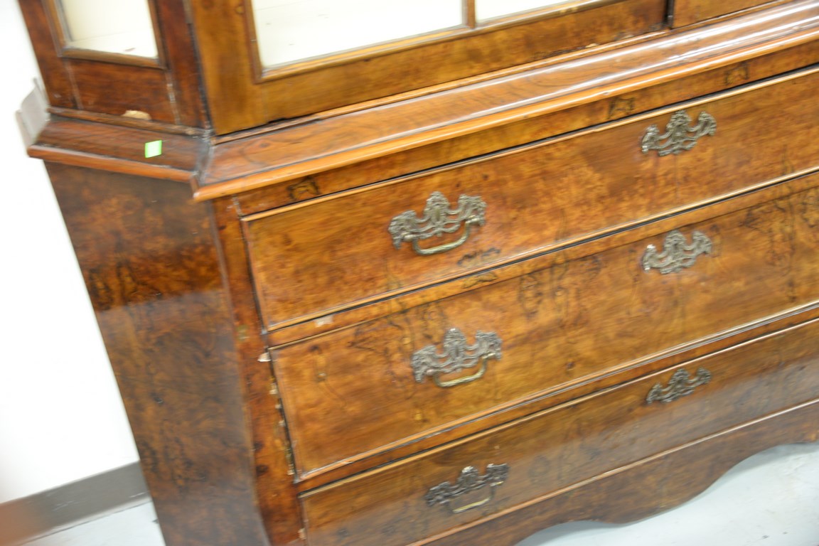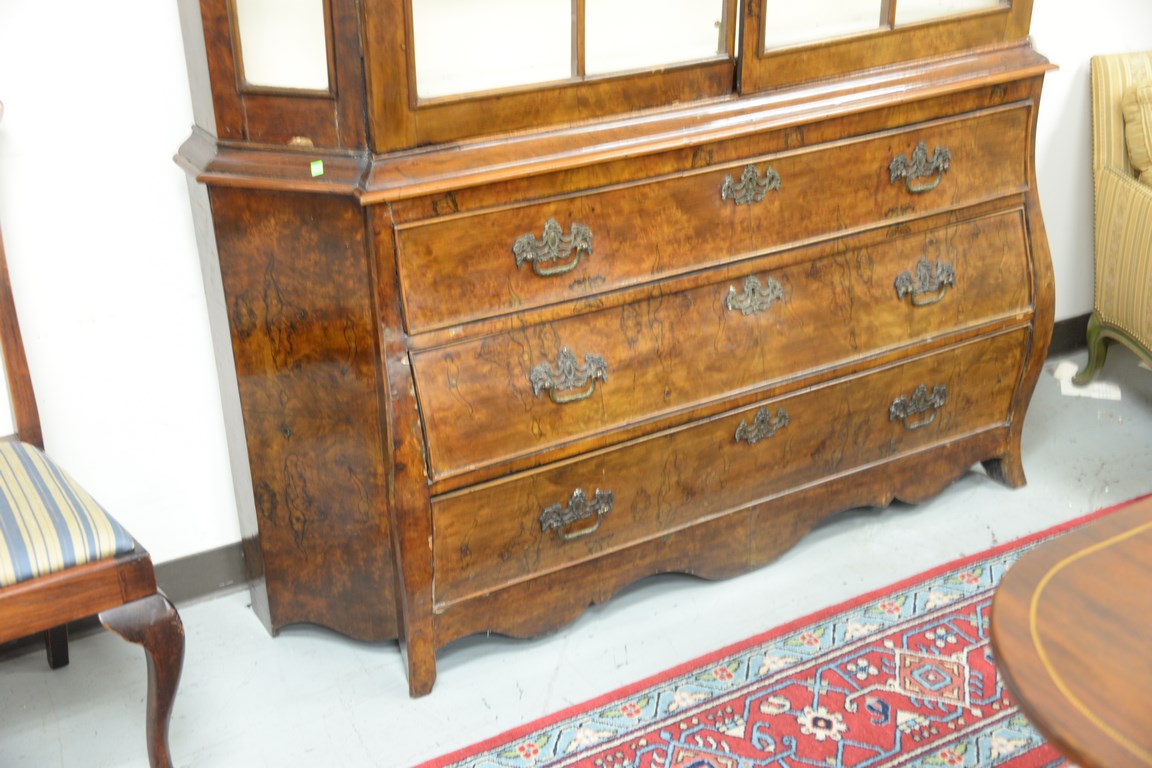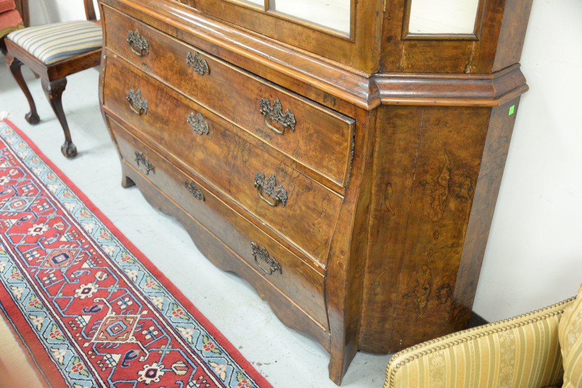 Lot 210: Dutch breakfront in two parts, upper section with arched top, two glazed doors on lower portion having three long drawers set on fla…