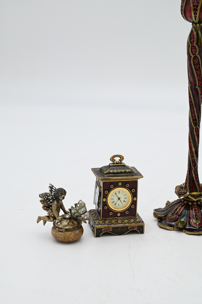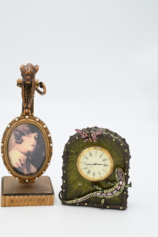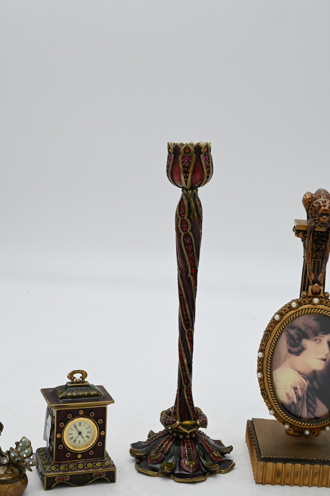 Lot 210: Five Piece Group of Enameled Pieces, to include four Jay Strongwater pieces, along with original boxes, to include Lizard enameled and jeweled clock; candlestick; small clock; cherub box with butterfly; along with a Berebi picture frame with monkey, tallest 8 3/4 inches.