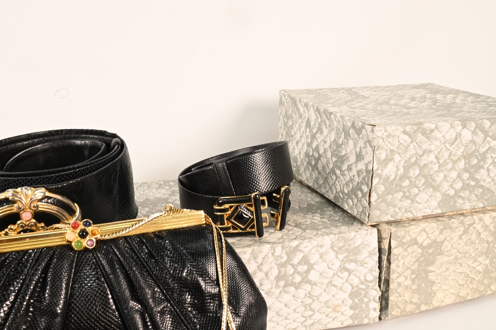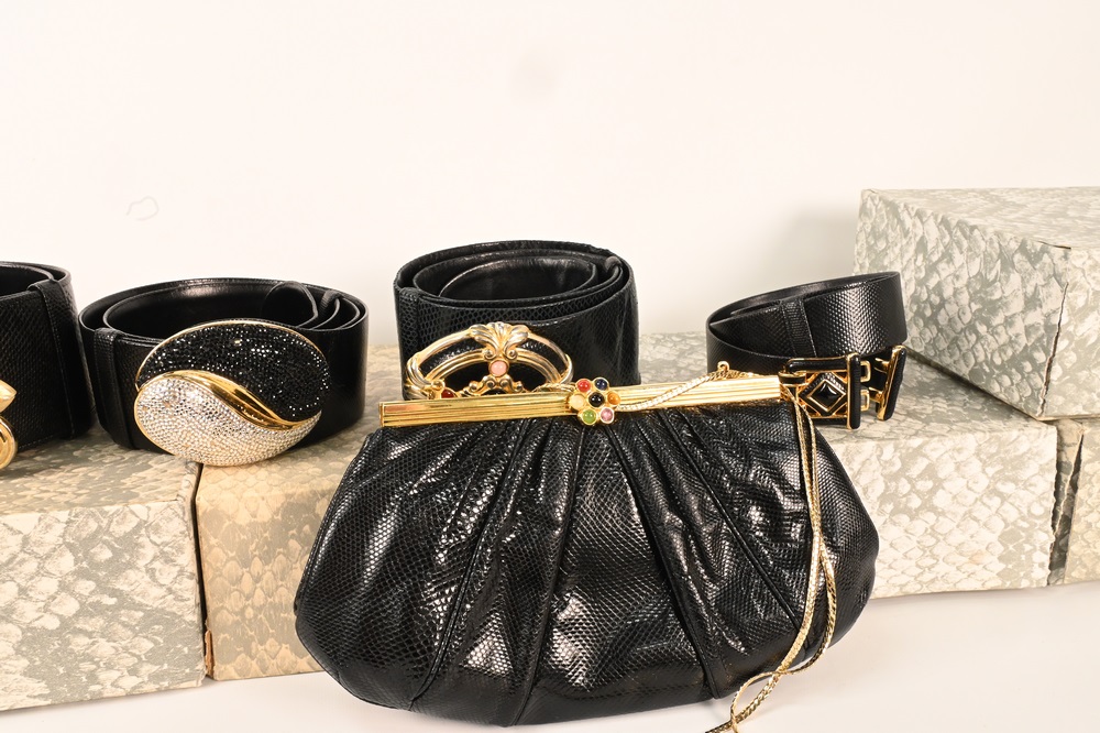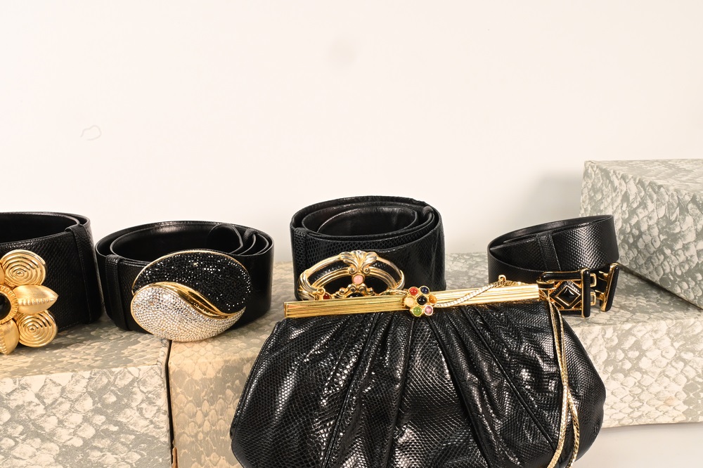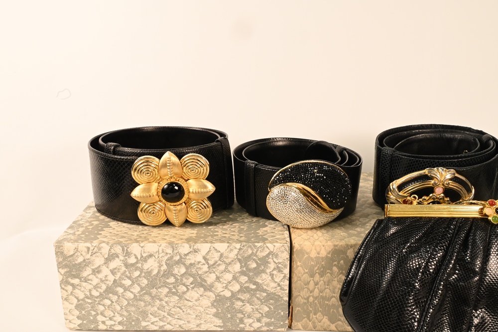 Lot 210: Five Piece Judith Leiber Group, to include black lizard skin clutch purse with jeweled clasp, four belts with large clasps, along wi…