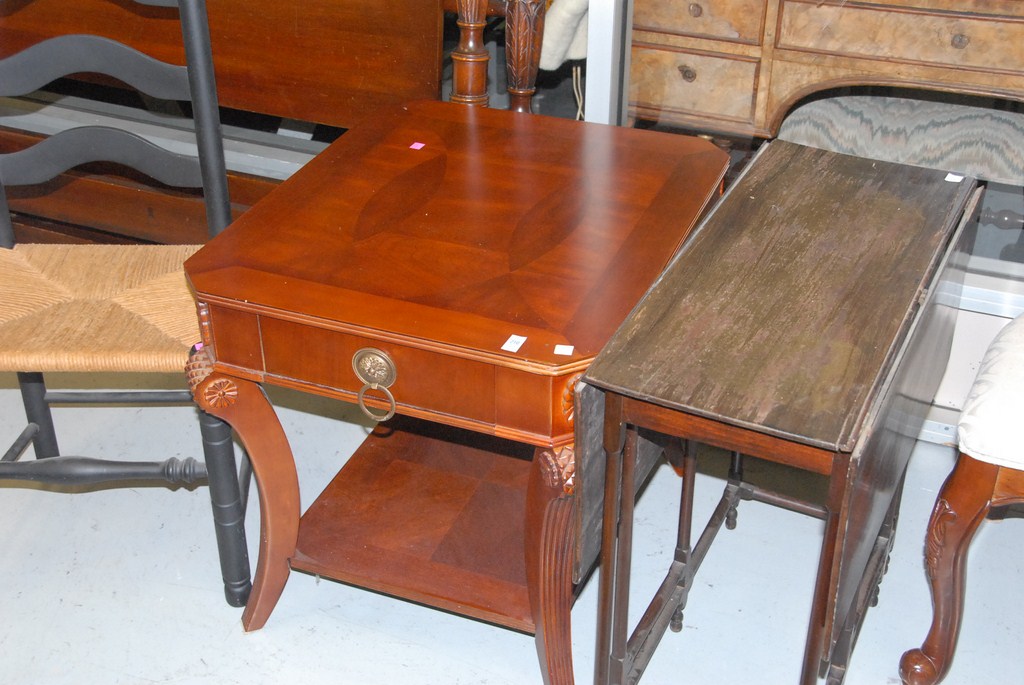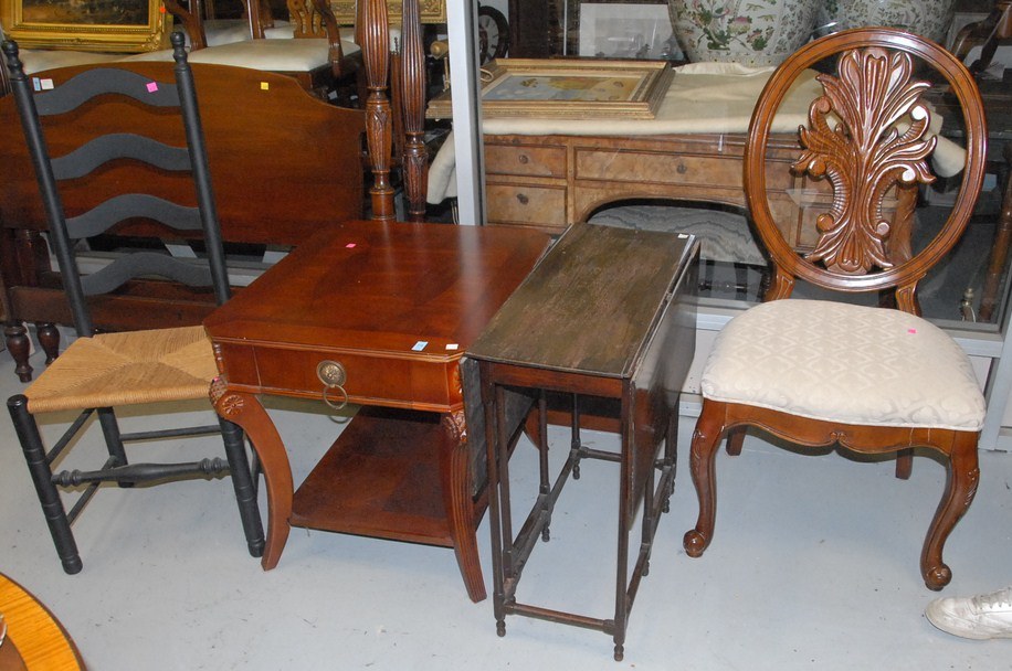Four piece lot ladder back chair, drop leaf table, decorative chair, and end table.