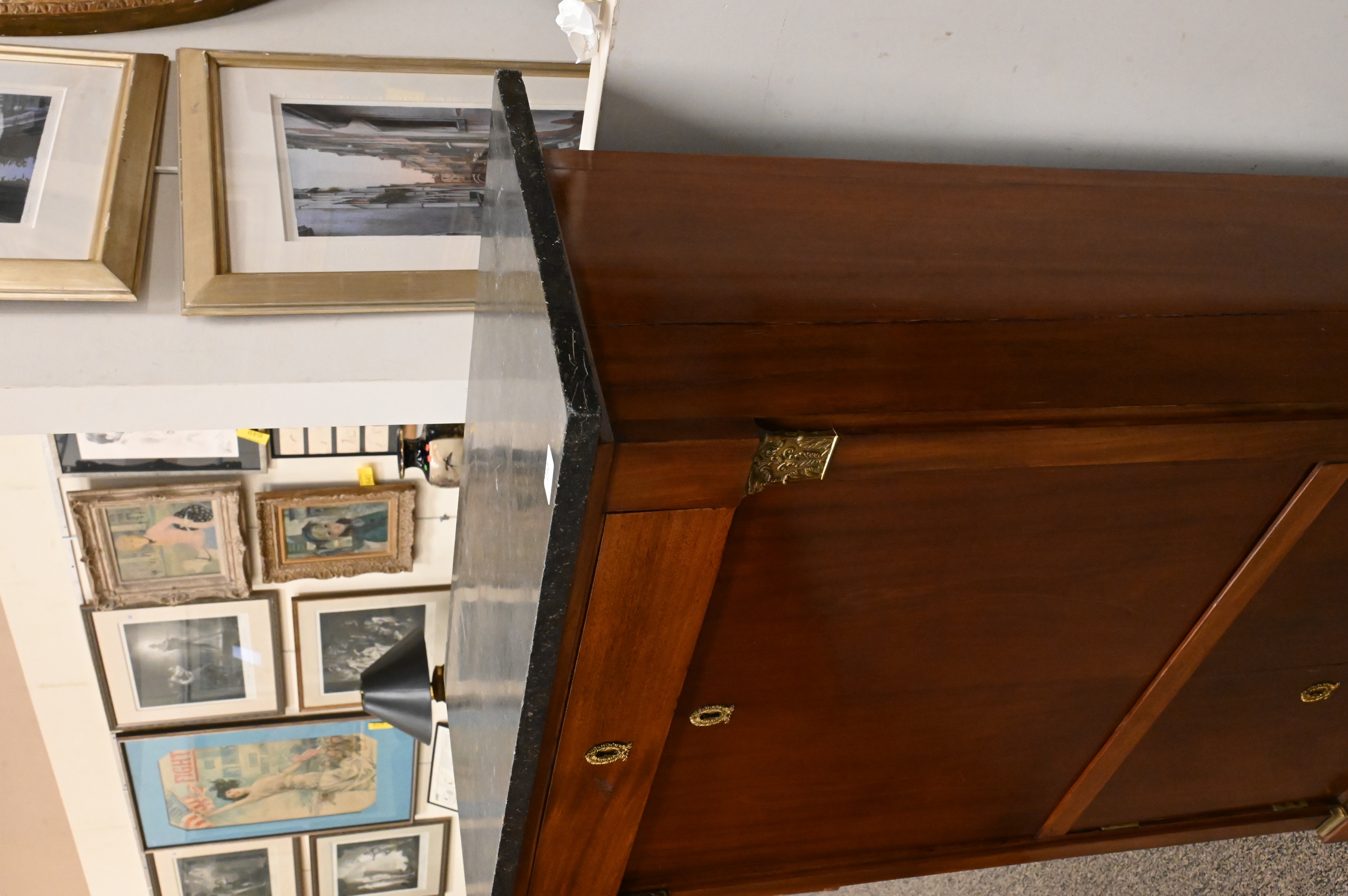 having grey marble top with brass mounts