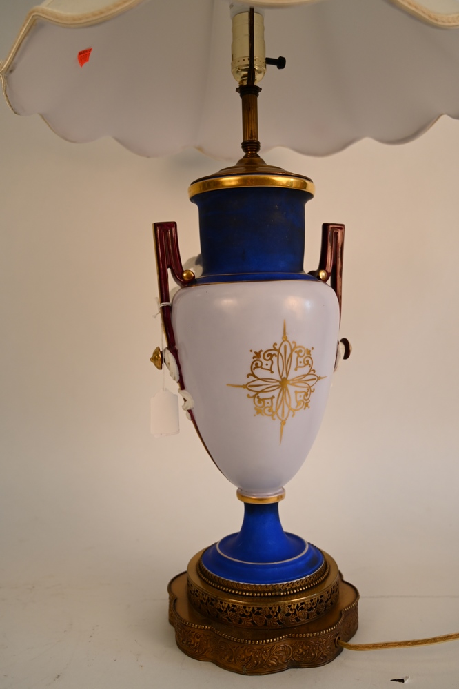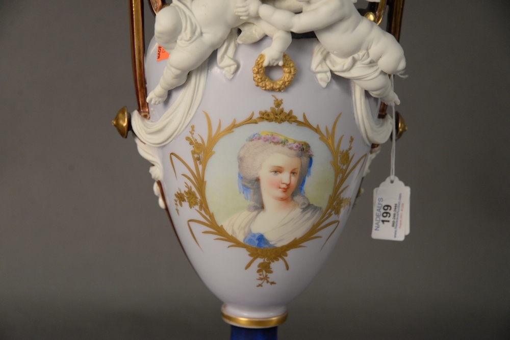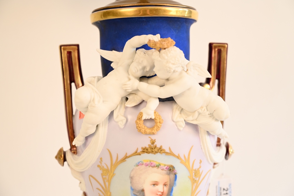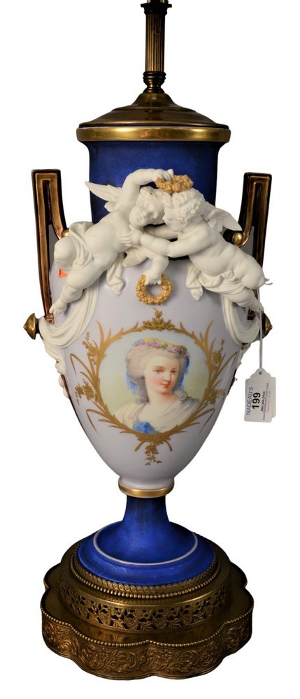 Lot 210: French Porcelain Figural Urn, having basalt putti figures with painted bust, made into a table lamp, vase height 15 inches, lamp height 35 inches.