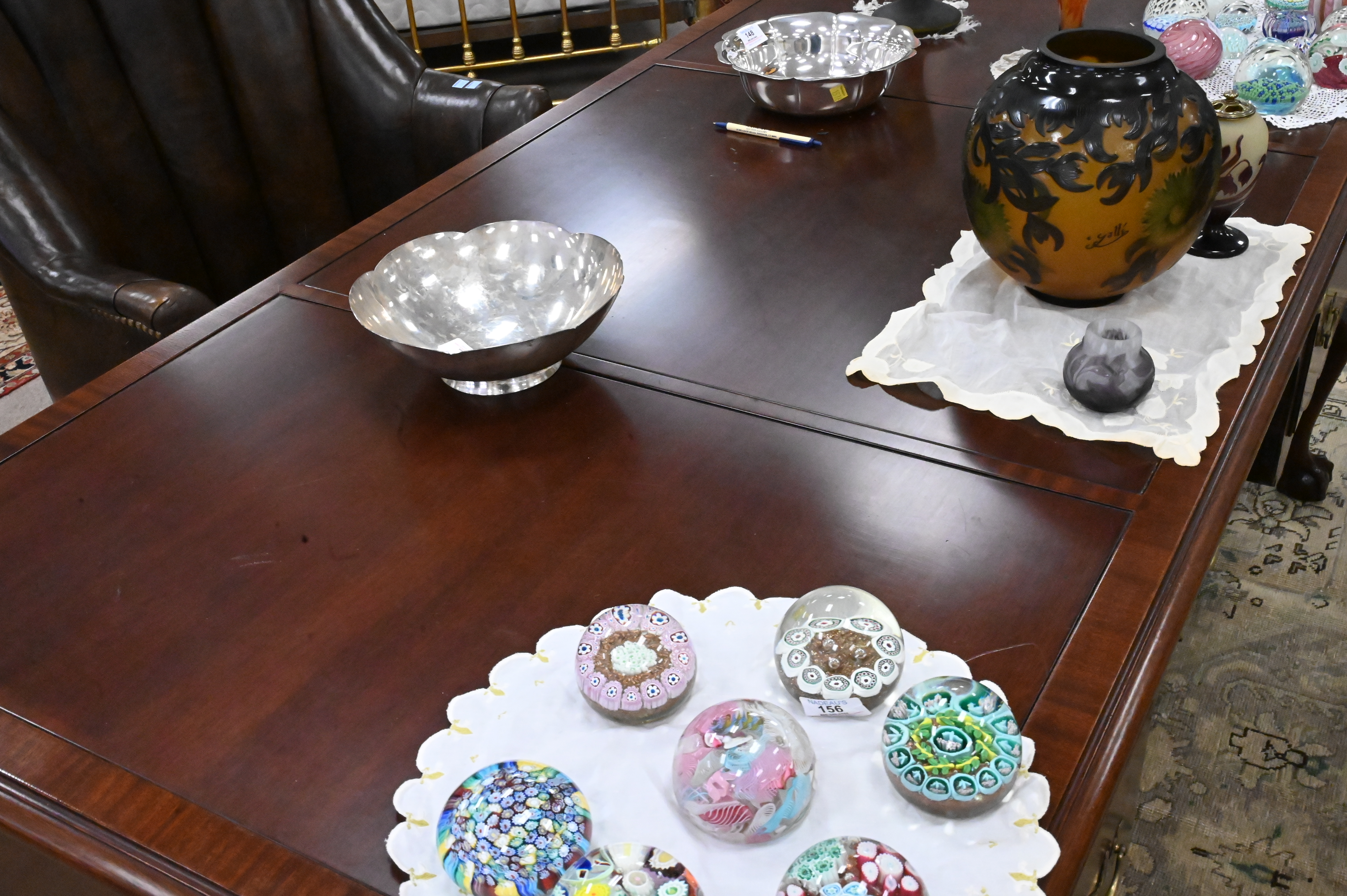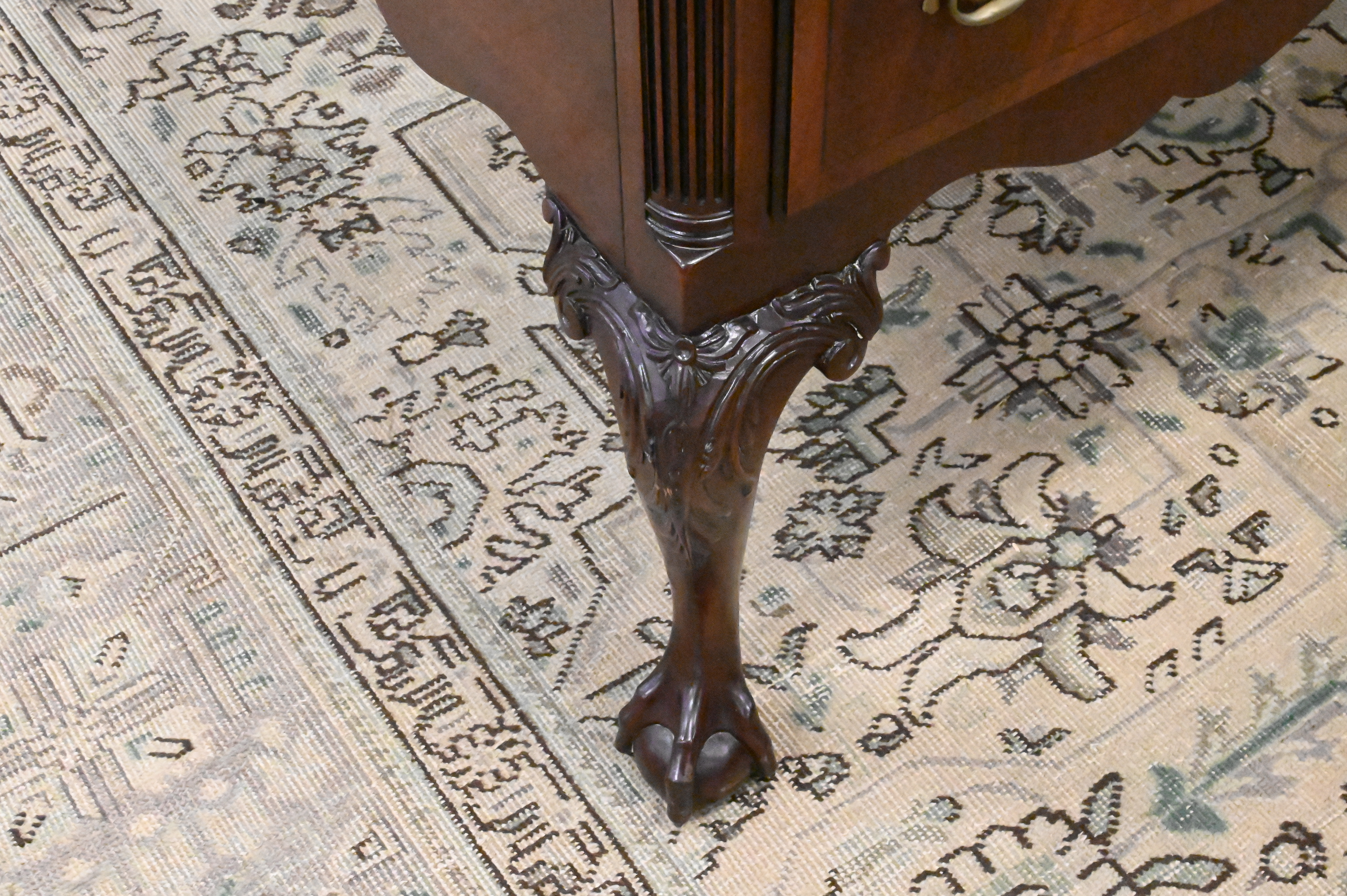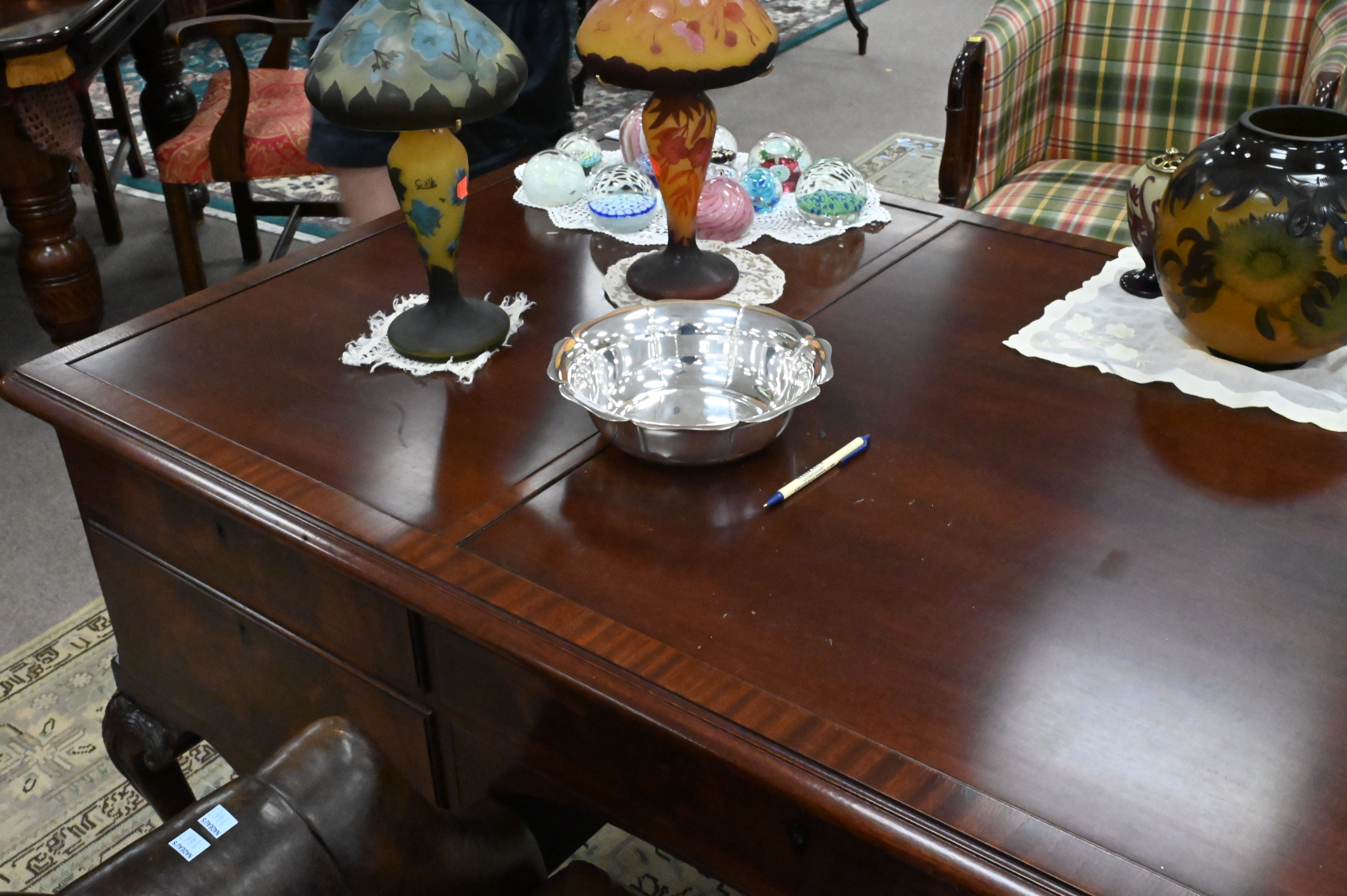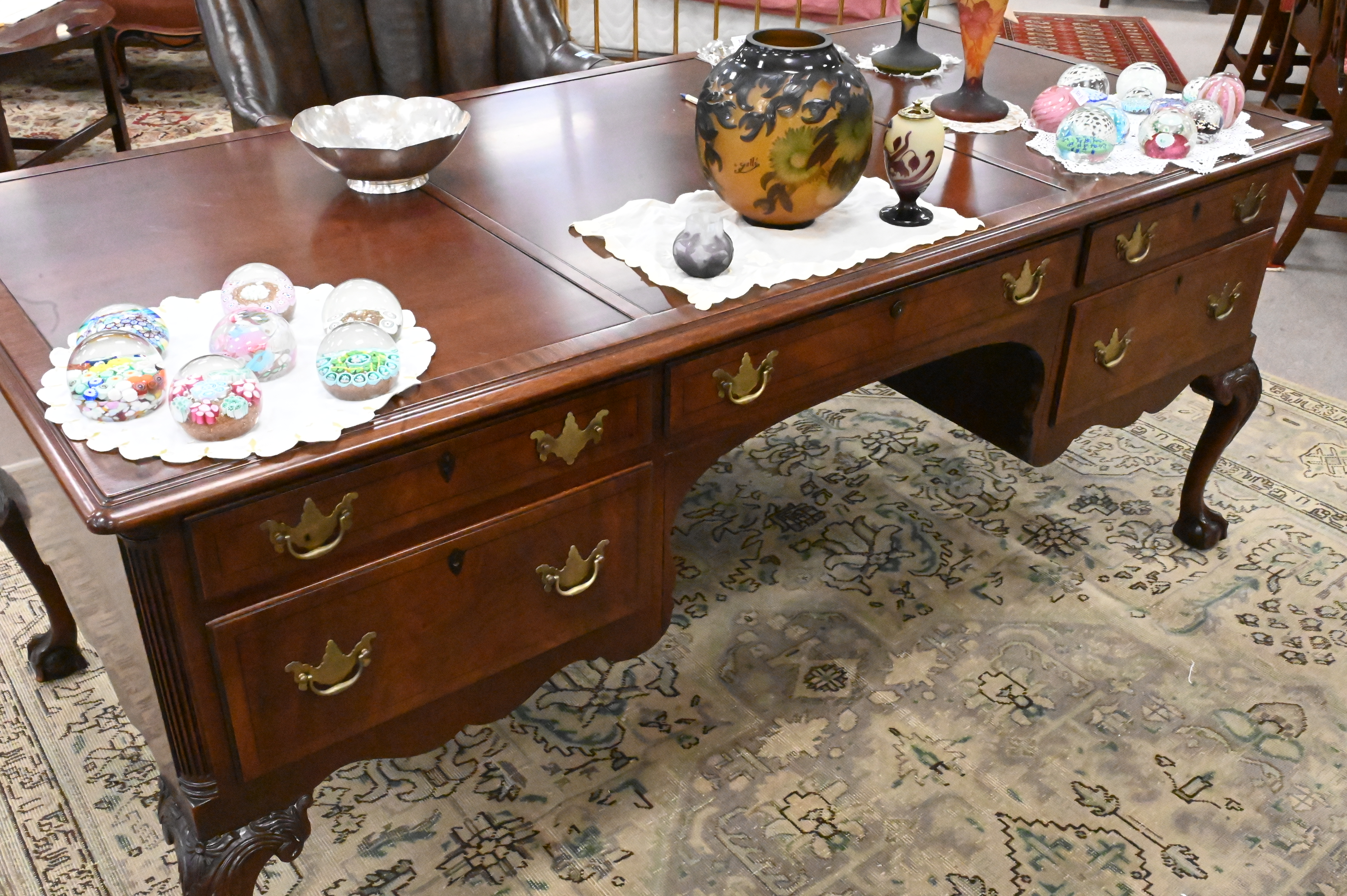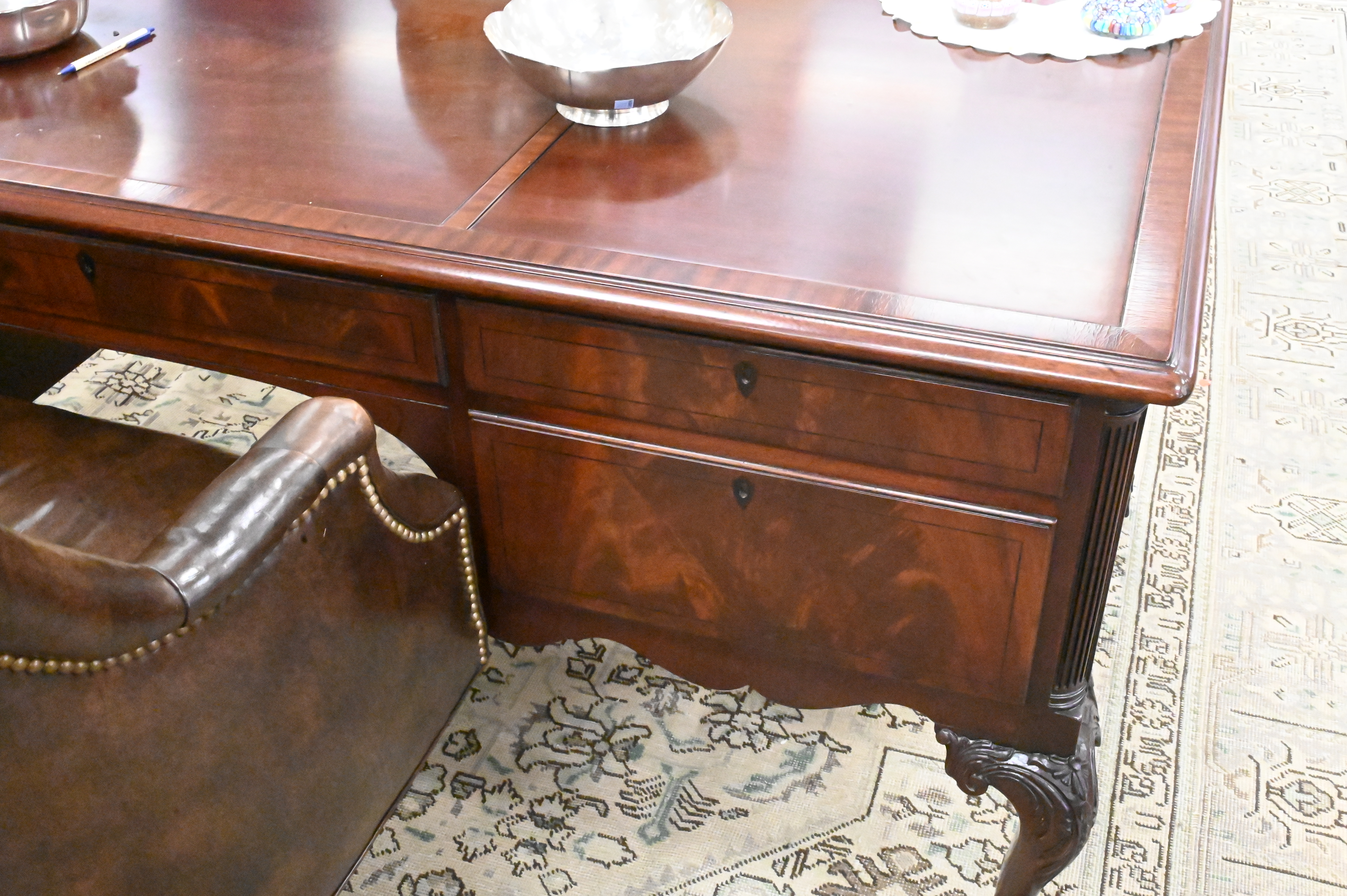 Kittinger Mahogany Partners Desk, one side having a center drawer flanked by two drawers, set on carved legs ending in ball and claw feet, height 30 inches, top 36″ x 72″.