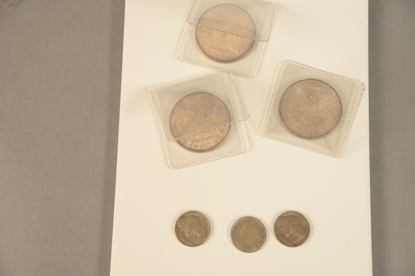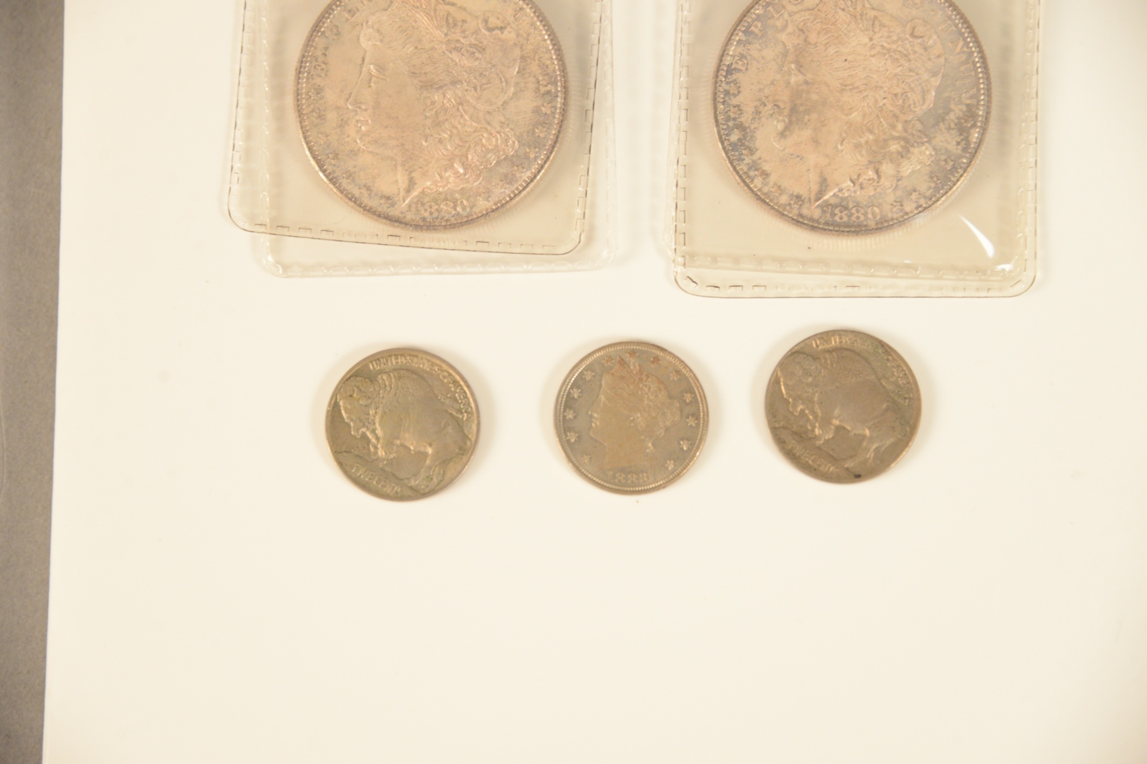 Lot 210: Lot of six coins to include, 3 1880’s B.U. silver dollars along with 1913 and 1913D Buffalo nickels, 1883 V-Nick B.U. Provenance: Th…