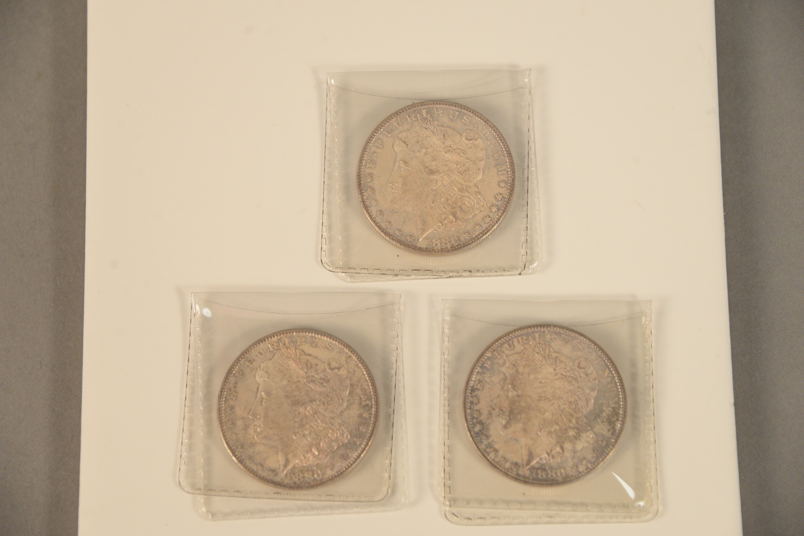 Lot of six coins to include, 3 1880’s B.U. silver dollars along with 1913 and 1913D Buffalo nickels, 1883 V-Nick B.U. Provenance: The Vincent Family Collection, Fairfield, Connecticut.