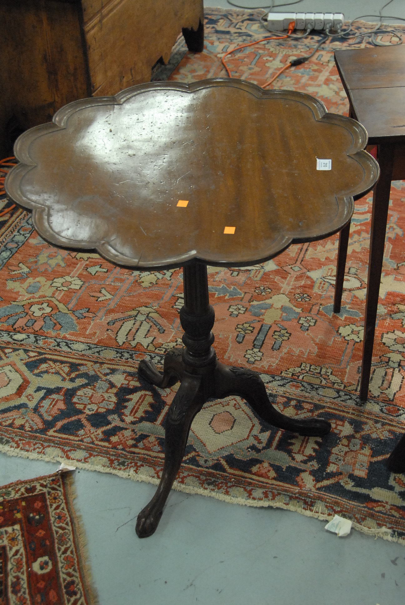 Mahogany pie crust tip table with shaped top on fluted and carved shaft, carved knees and claw and ball feet, 18th century. ht. 28in. top: 26 1/2 x 27