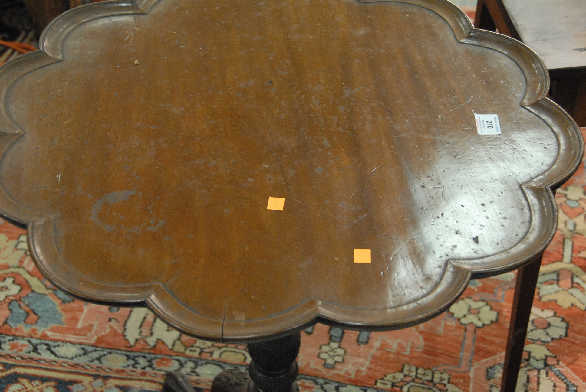 Lot 210: Mahogany pie crust tip table with shaped top on fluted and carved shaft, carved knees and claw and ball feet, 18th century. ht. 28in. top: 26 1/2 x 27