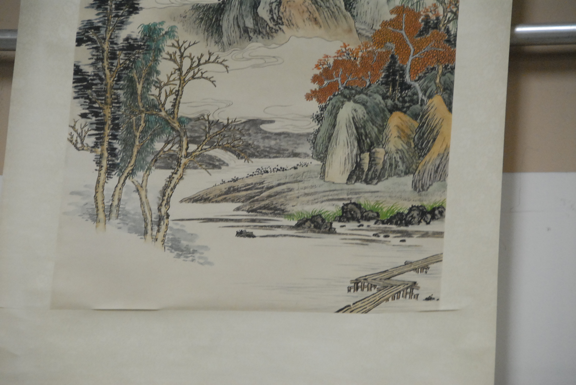 Oriental scroll watercolor on paper of mountainous landscape, 35 x 18.