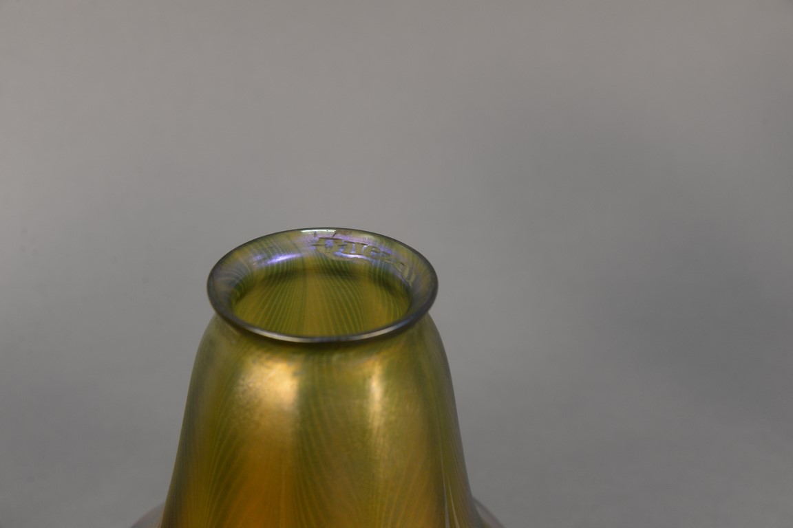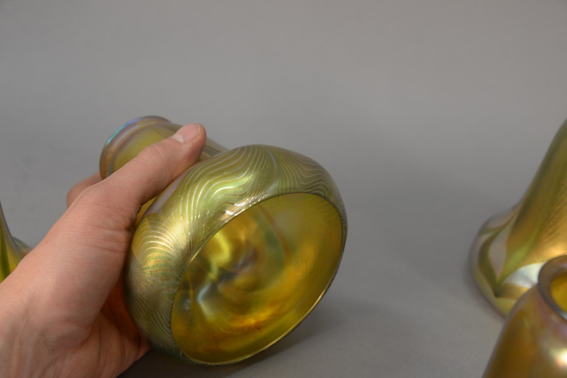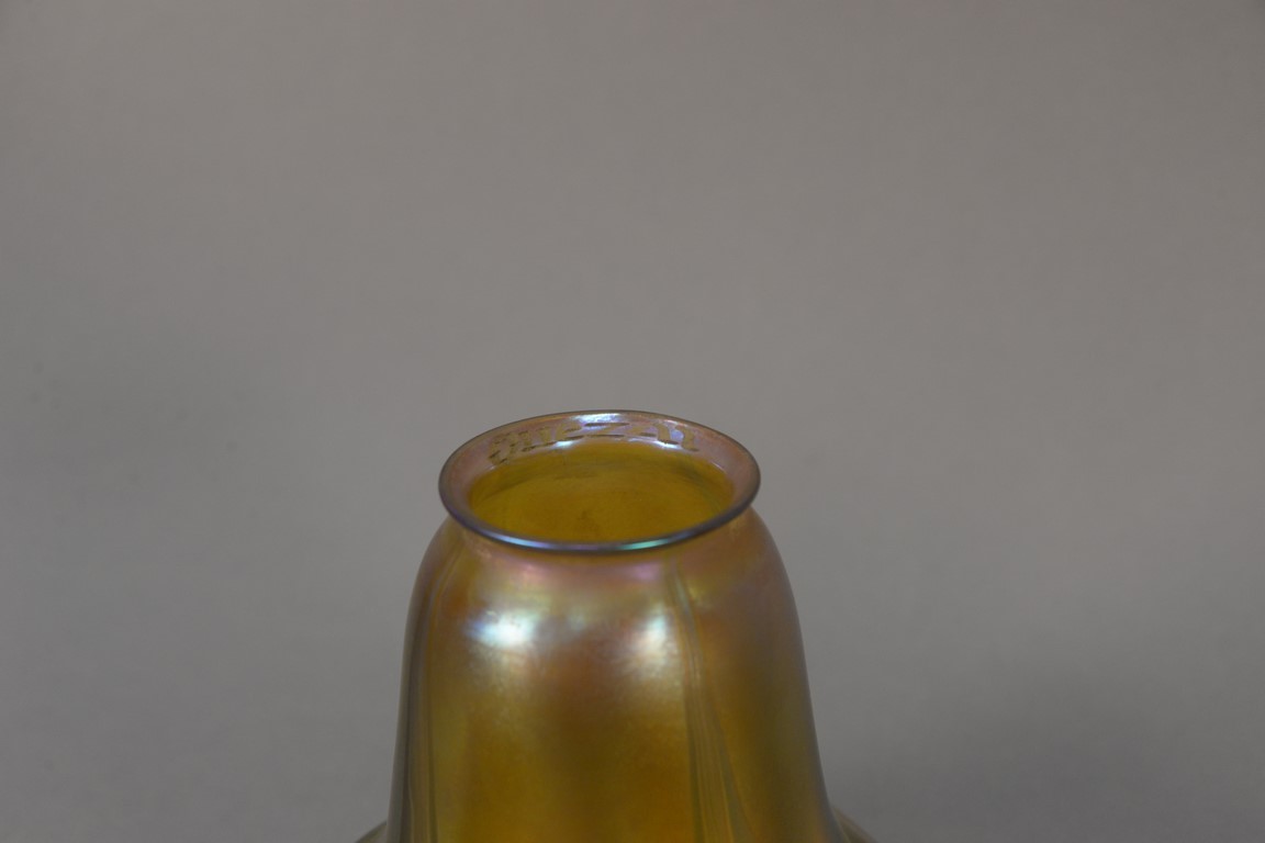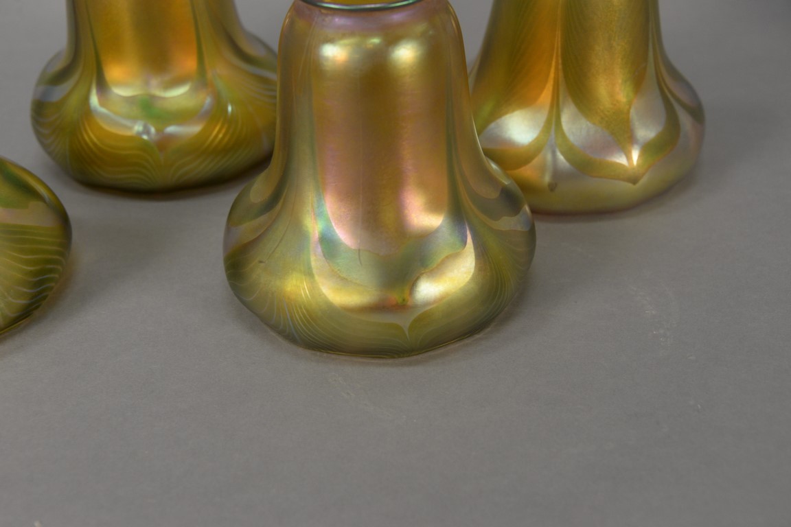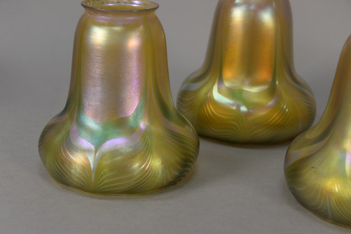 Lot 210: Set of four Quezal art glass shades, gold iridescent and pulled feather design. ht. 5 1/4in. one with heat crack.
