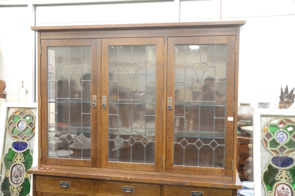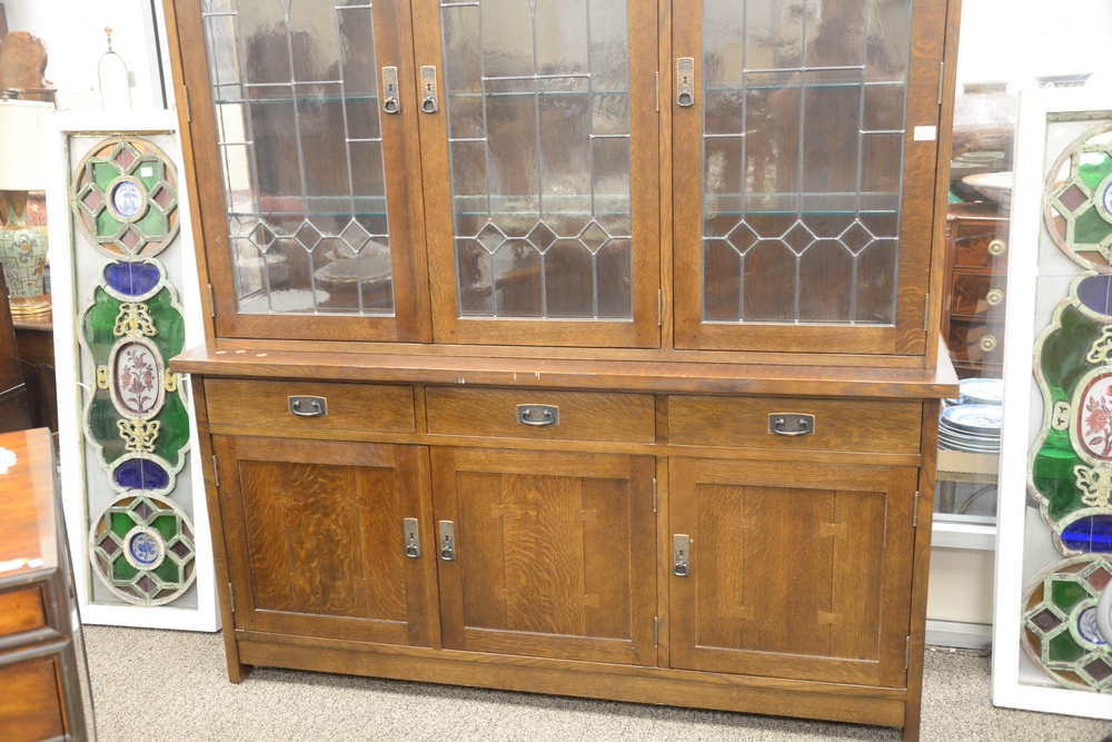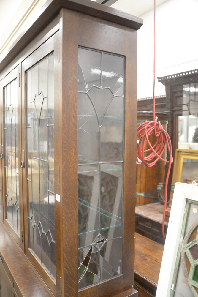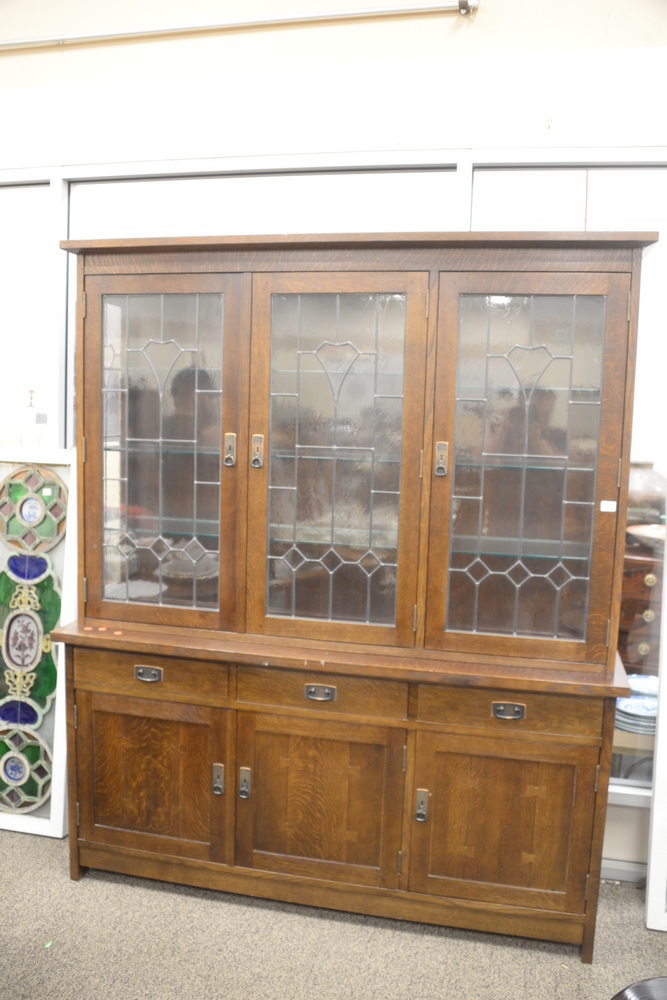 Lot 210: Stickley Two Part Breakfront, having three leaded glass doors over base and three drawers over three doors with hand hammered hardwa…