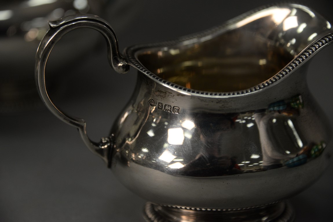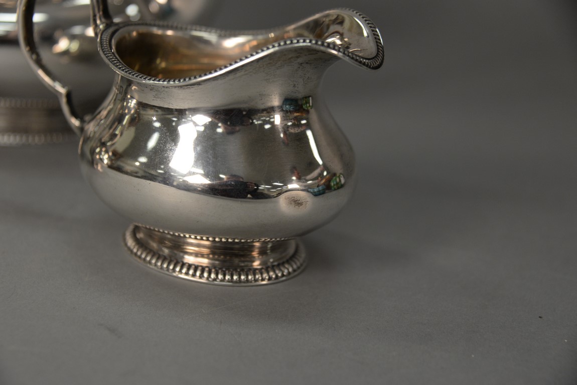 Three piece sterling tea set comprising of a teapot, sugar and creamer, having four hallmarks and marked on bottom Made in England Sterling. pot: ht. 6 1/2 in. 45.5 t oz.