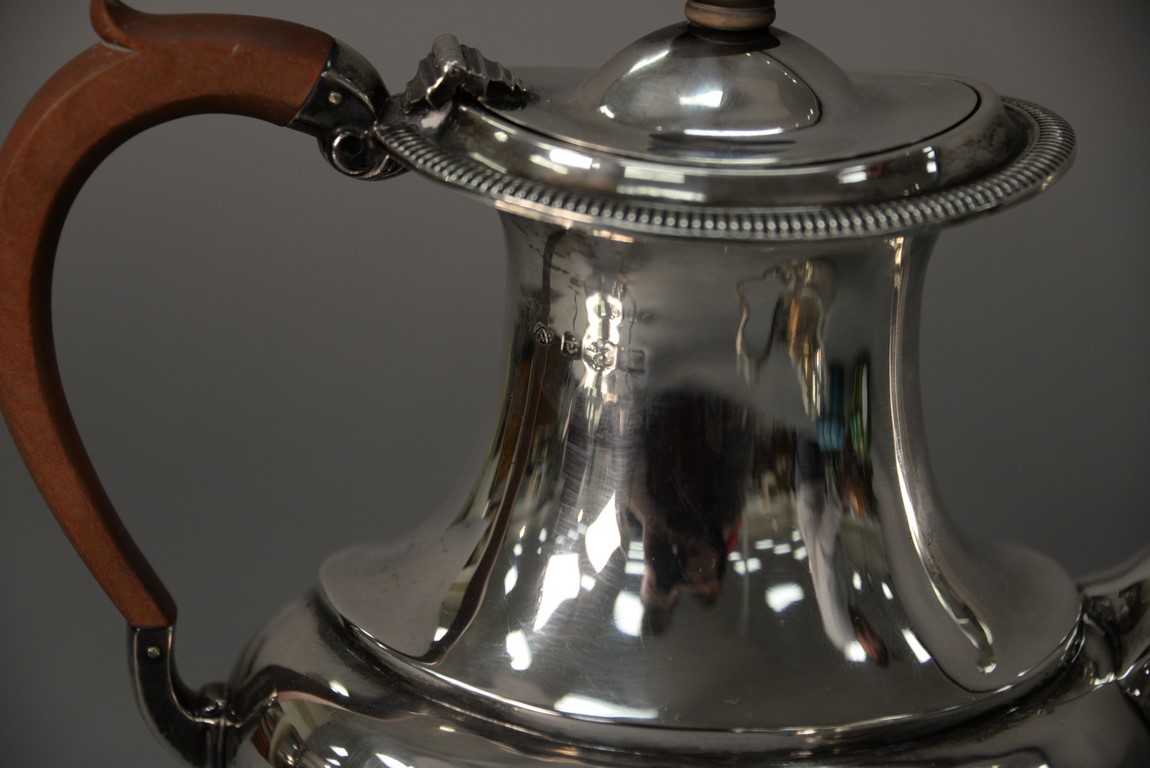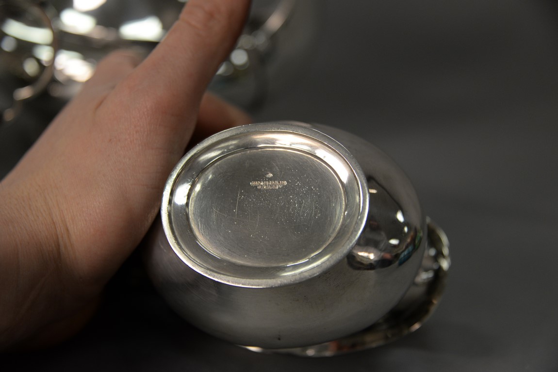 Lot 210: Three piece sterling tea set comprising of a teapot, sugar and creamer, having four hallmarks and marked on bottom Made in England Sterling. pot: ht. 6 1/2 in. 45.5 t oz.