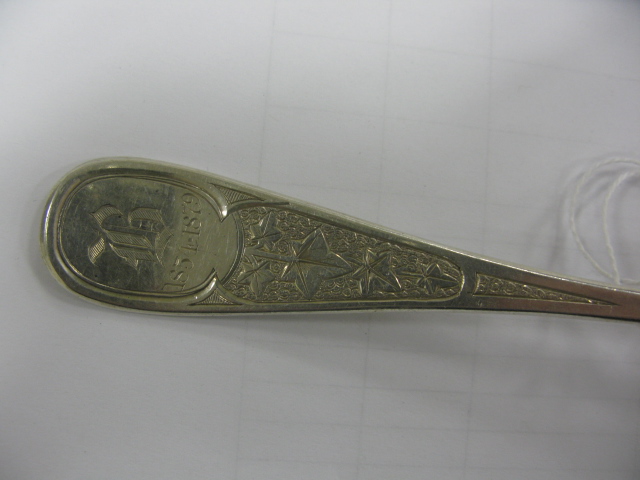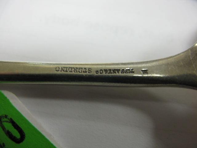 Tiffany Company sterling silver serving spoon, monogrammed with a B 1854-1879.
