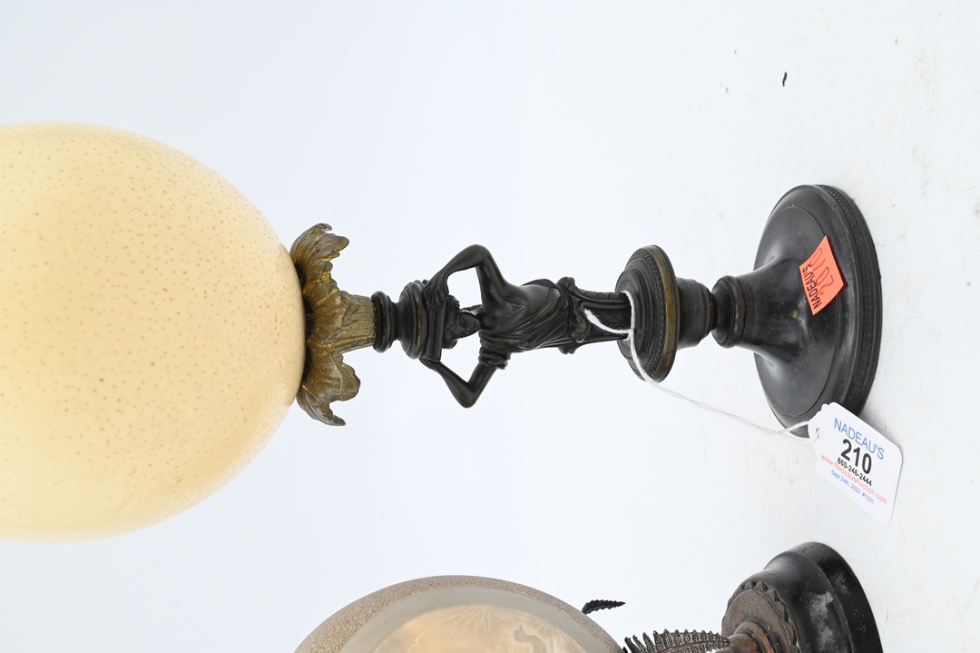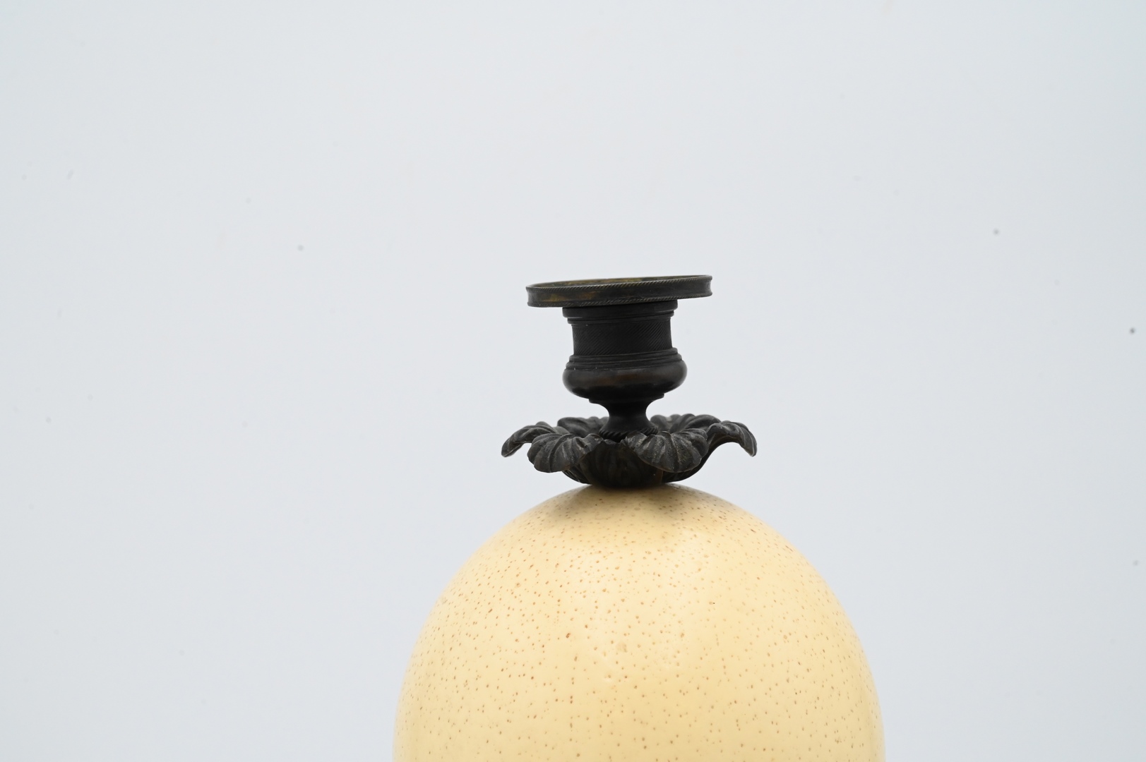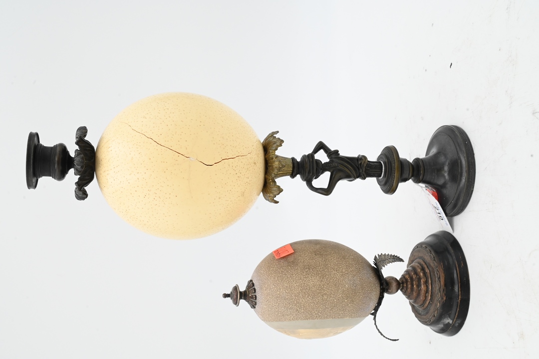 Two Mounted Eggs, to include a carved emu egg on silver plated tree, along with an ostrich egg figural candlestick, heights 15 and 8 inches.