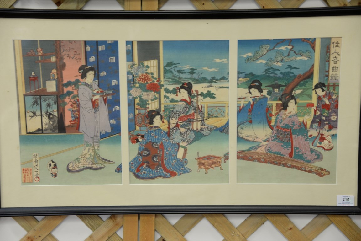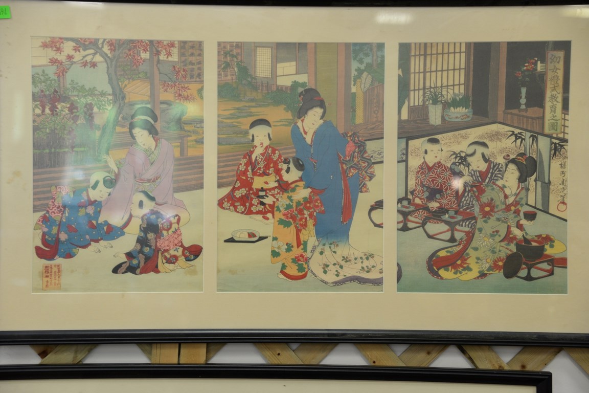 Lot 210: Two Oriental woodblock triptychs of Guanyins including one with Guanyin and two boys in courtyard and the other of Guanyin playing i…
