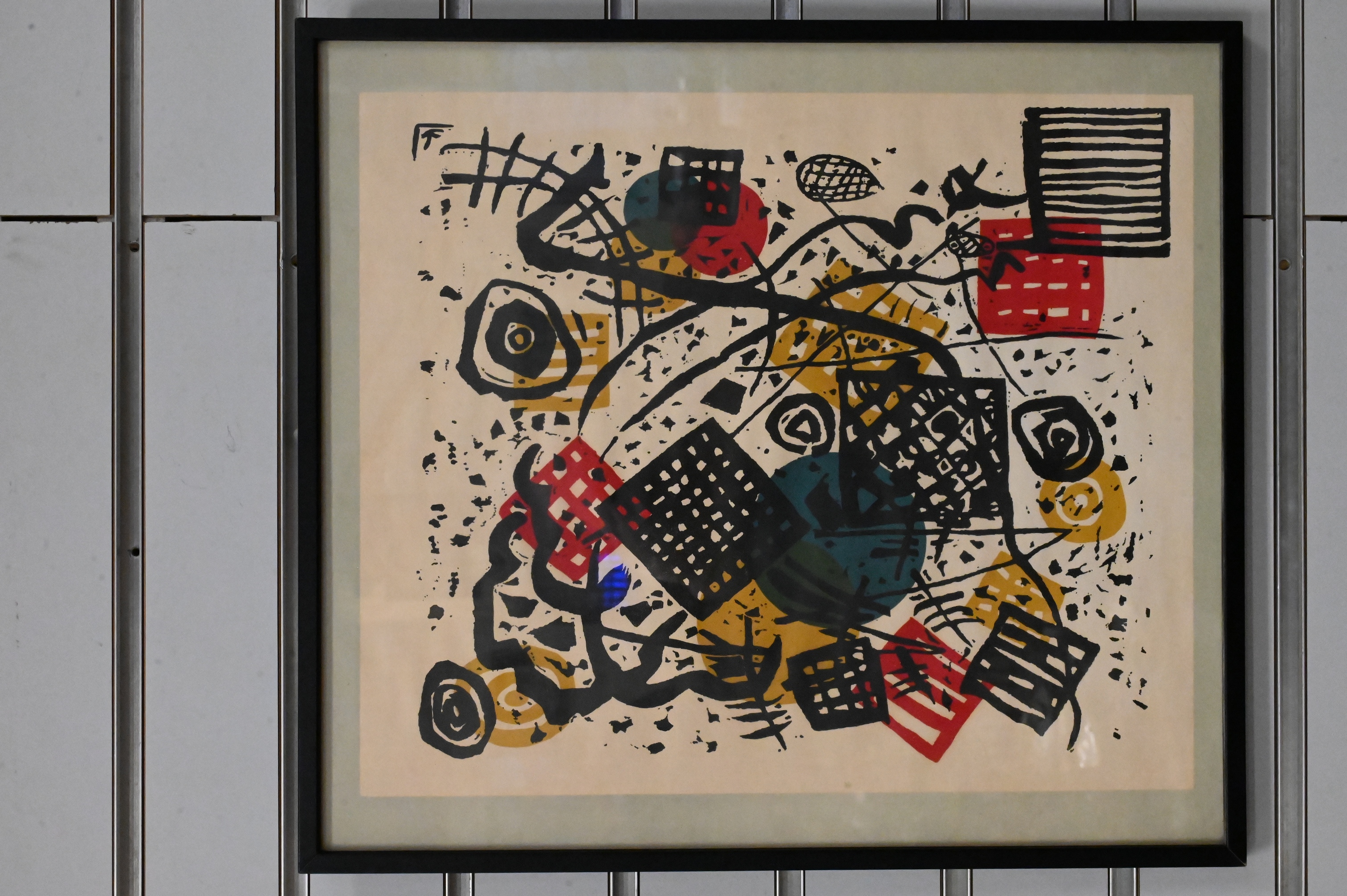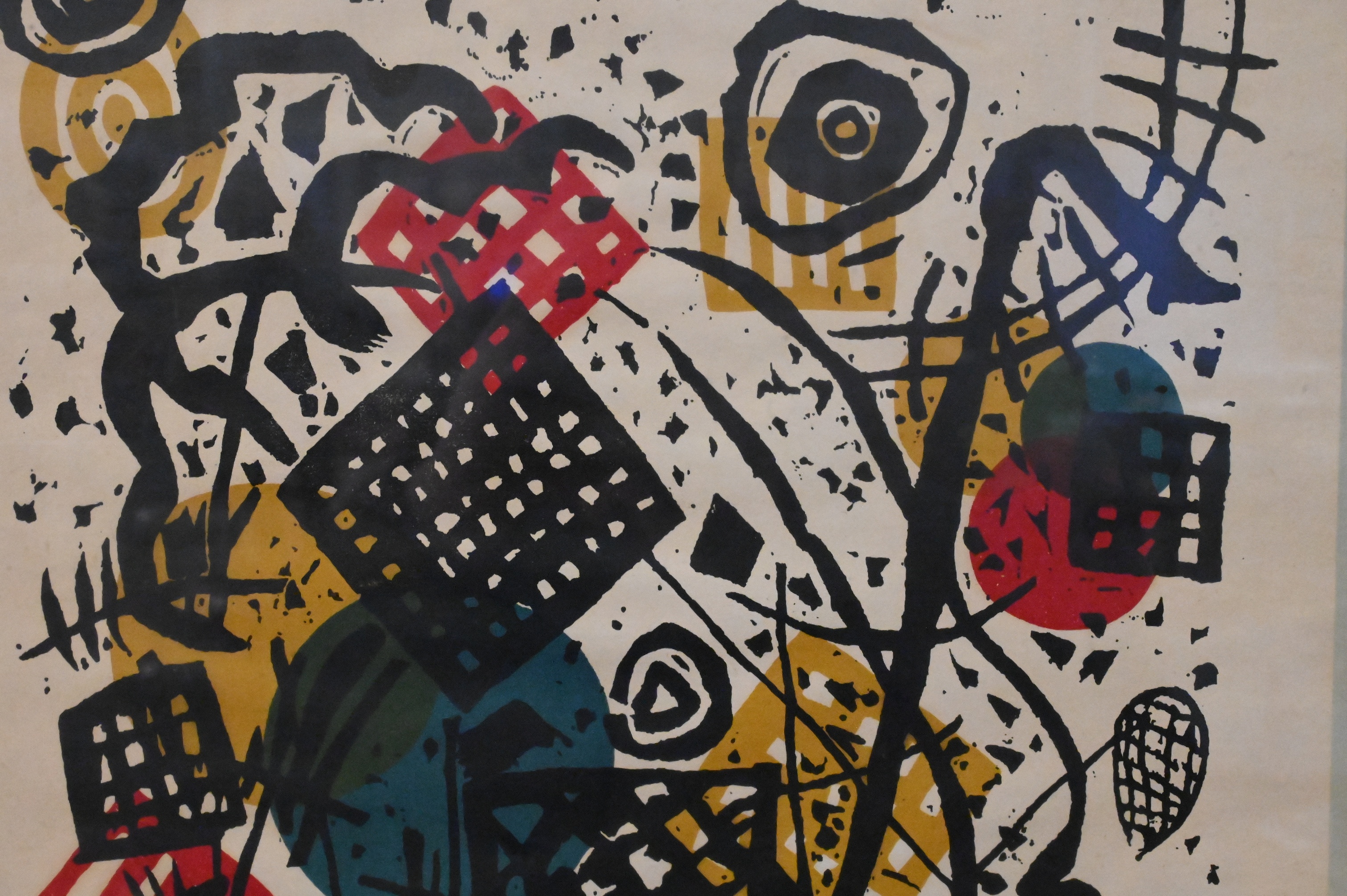 Woodcut in black, red, yellow and blue