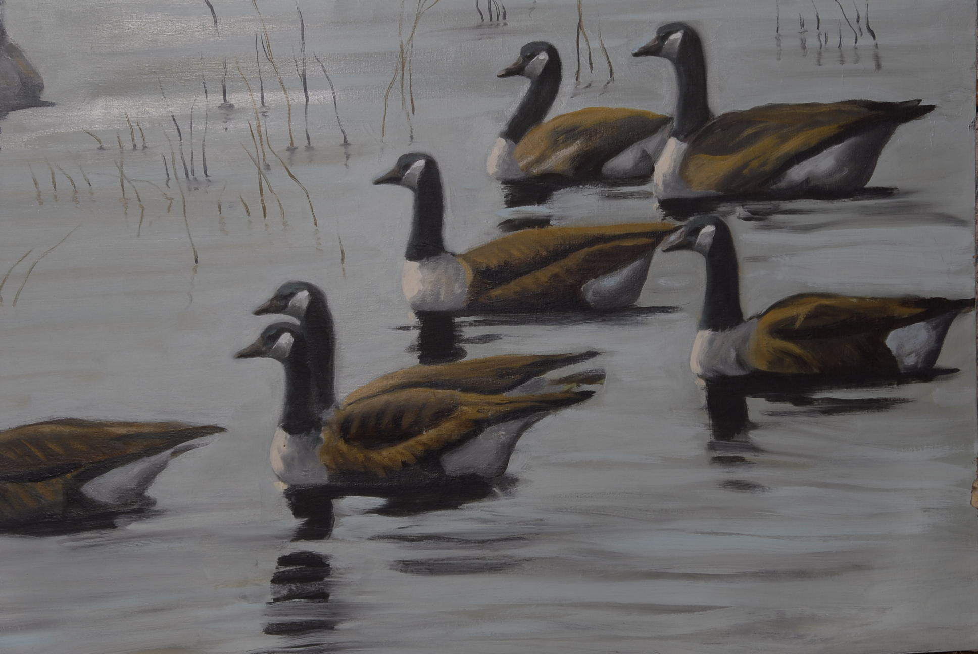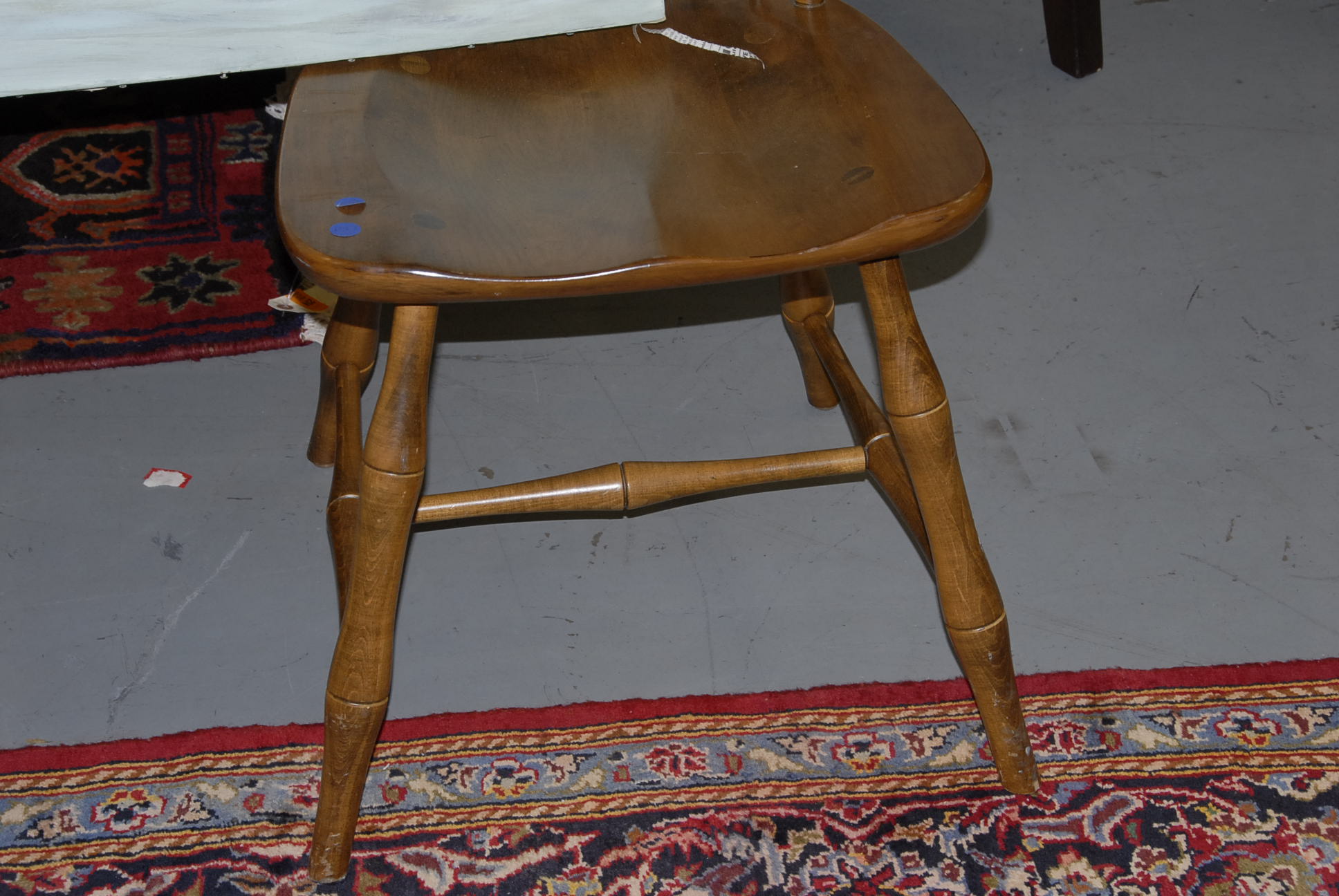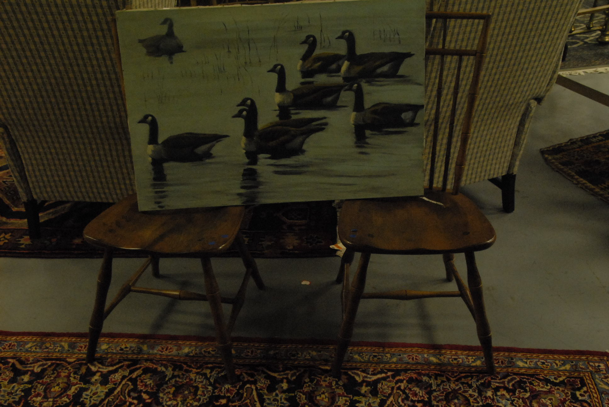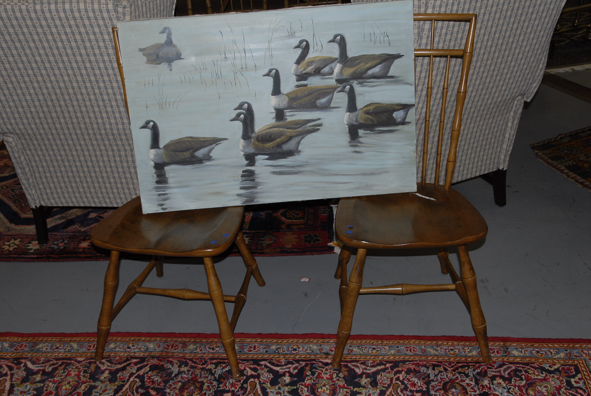 A pair of maple Ethan Allen Windsor style chairs along with oil on canvas of ducks and pond