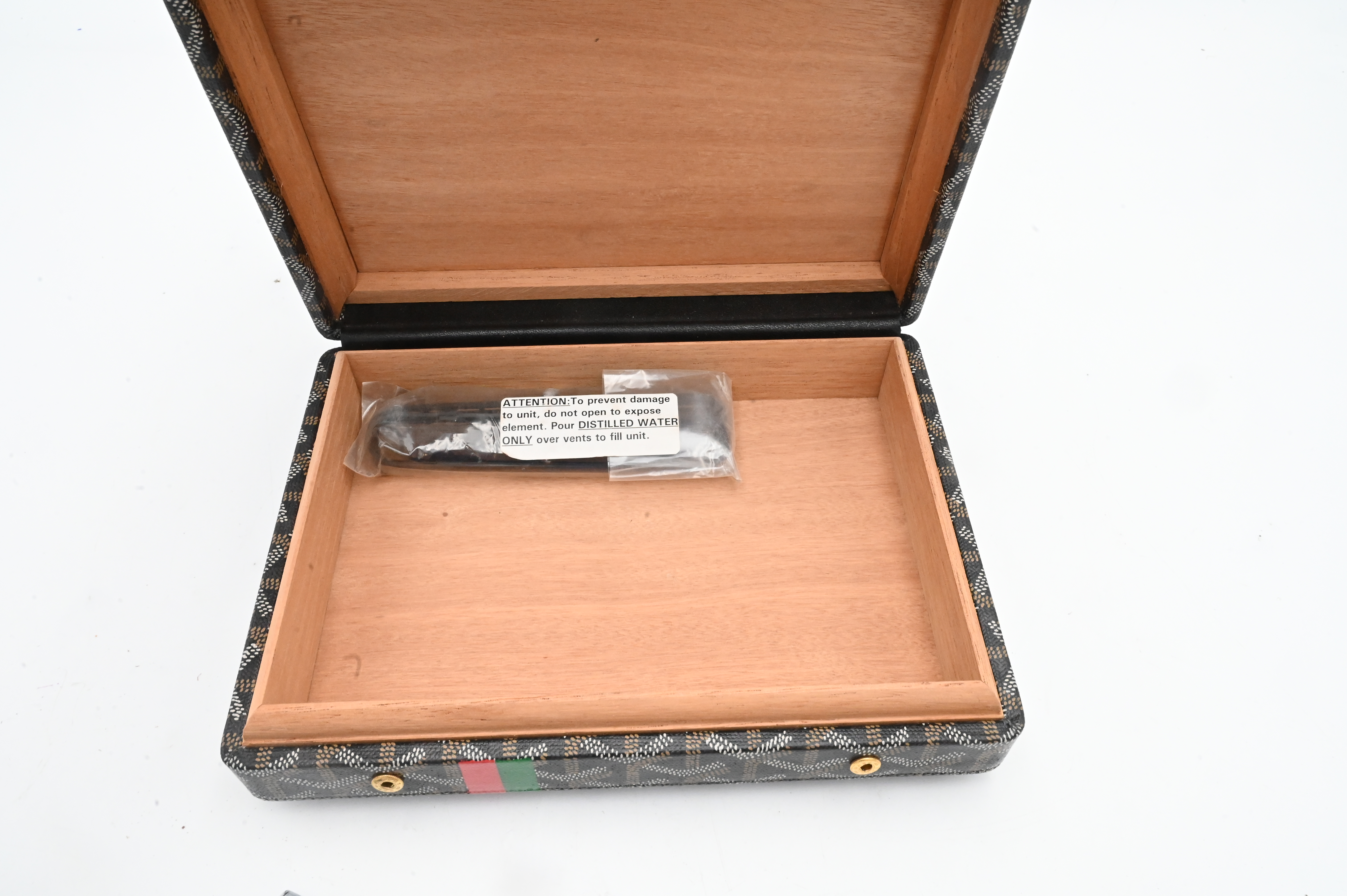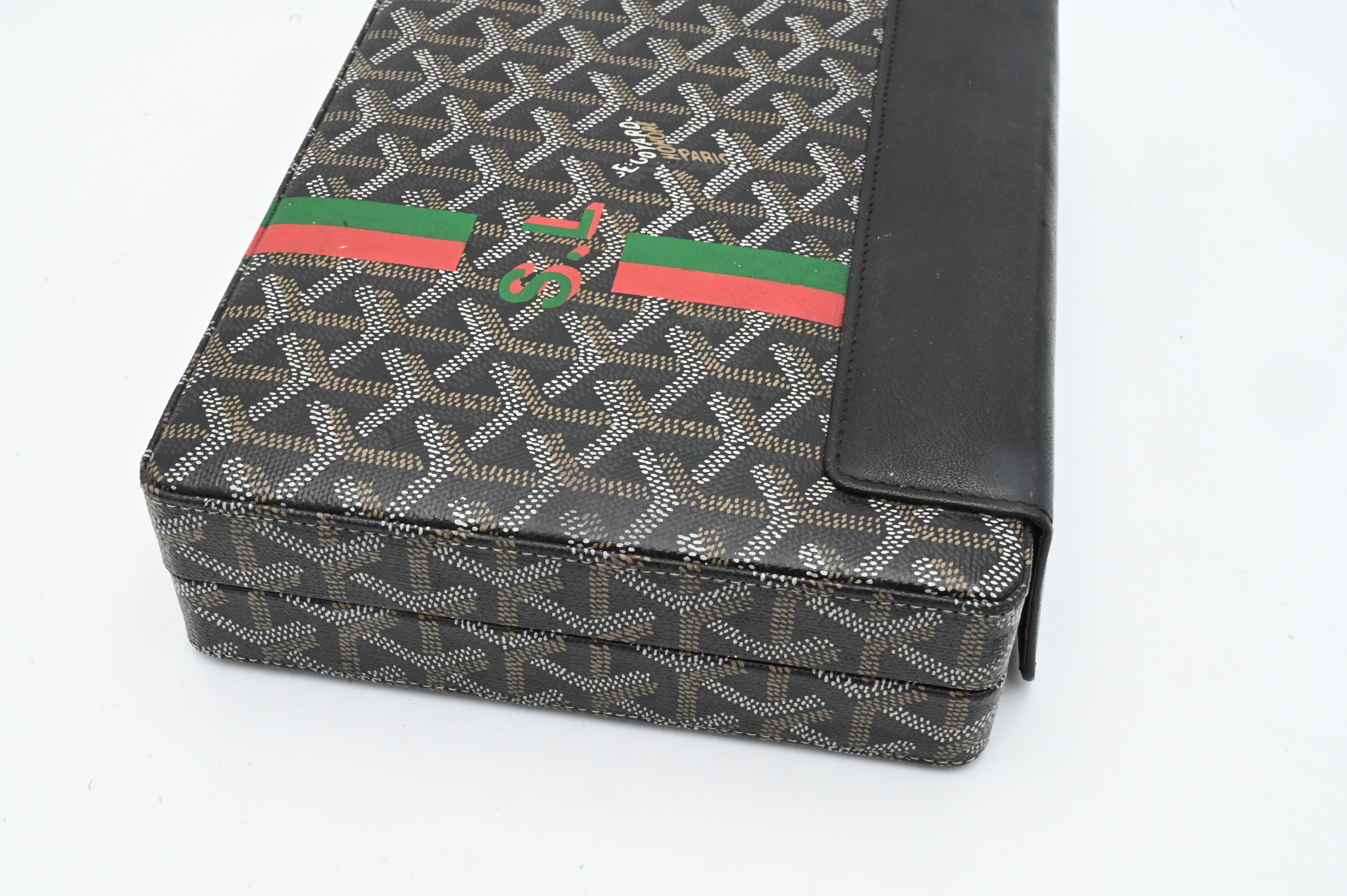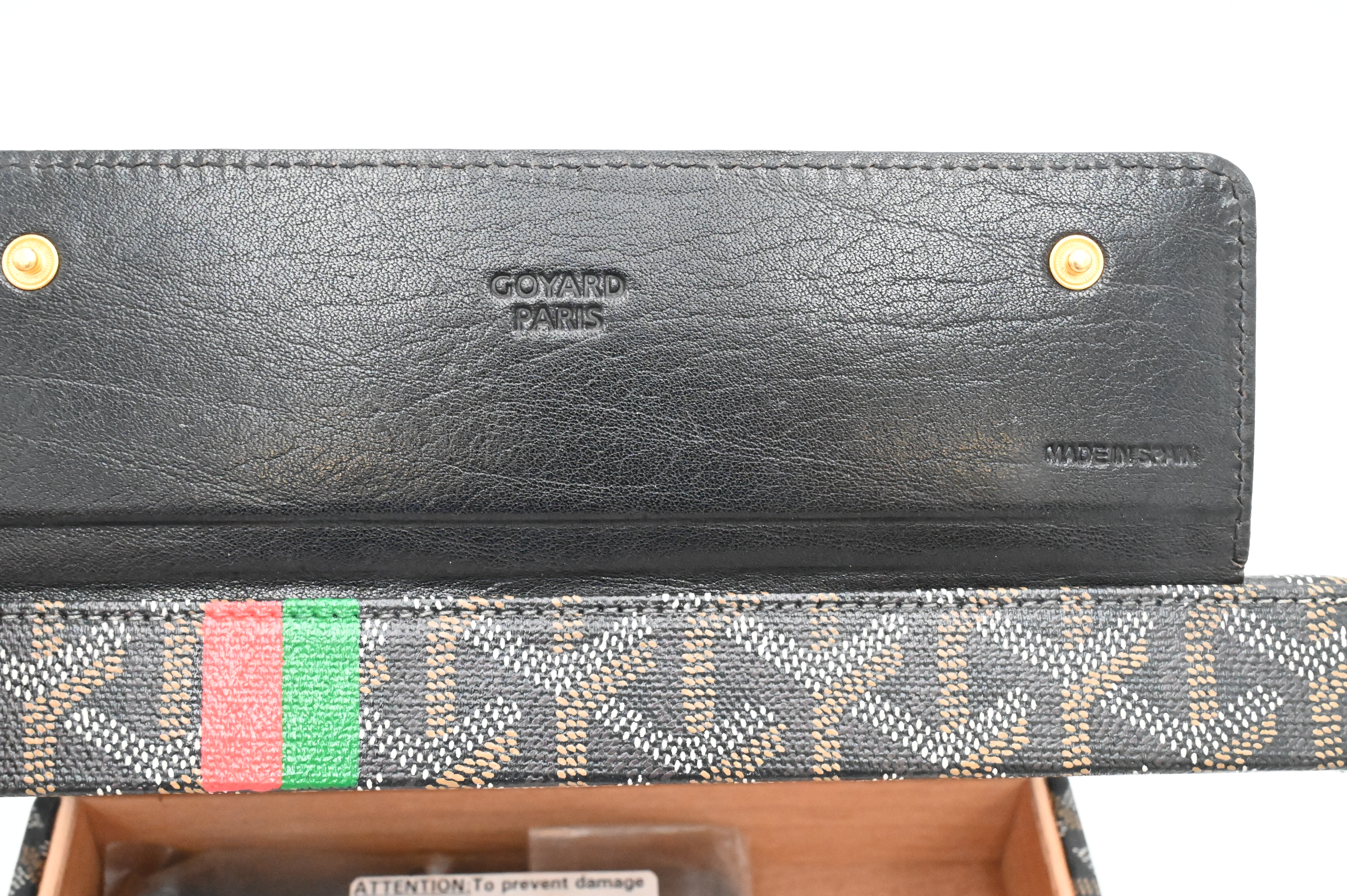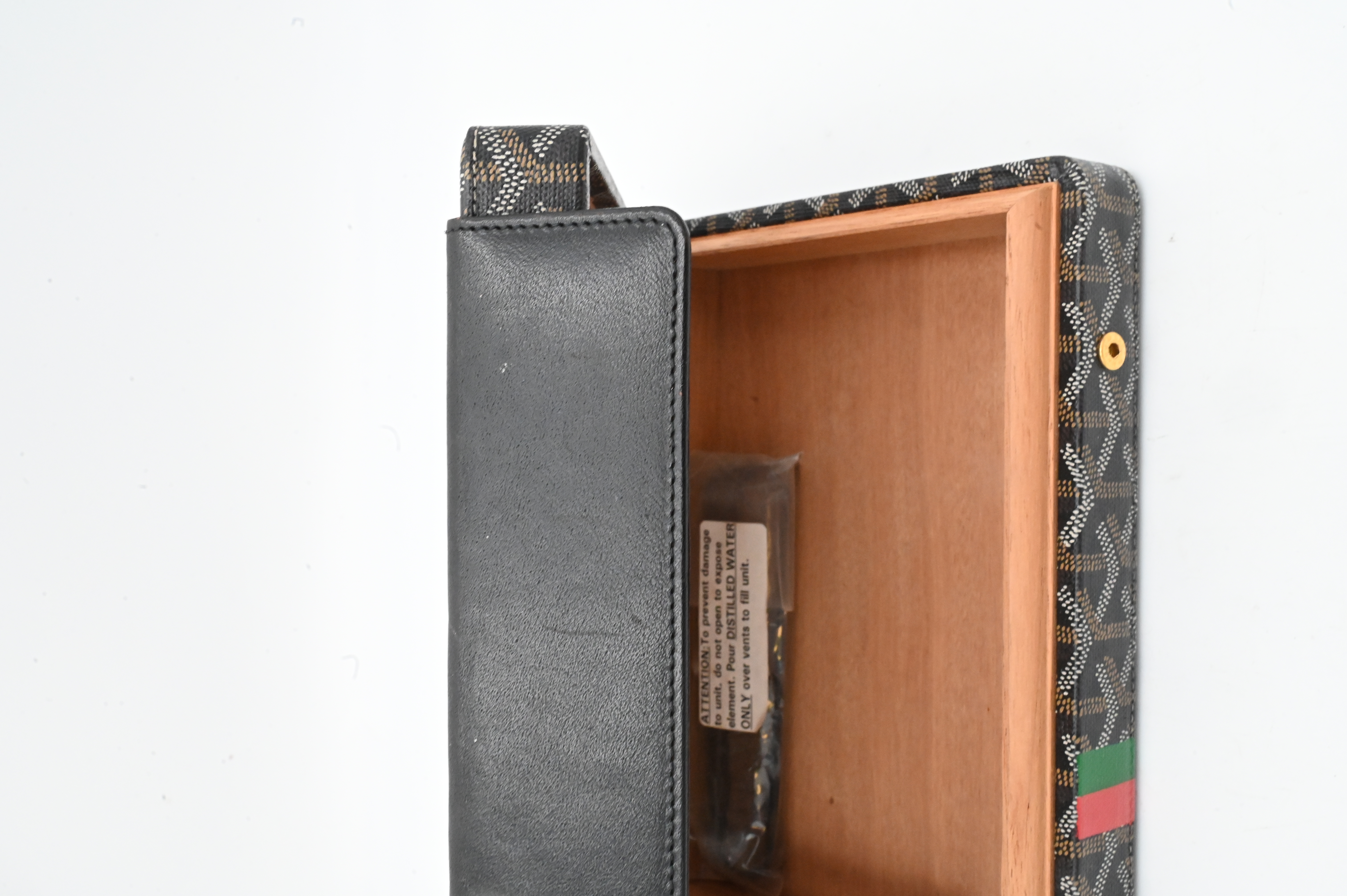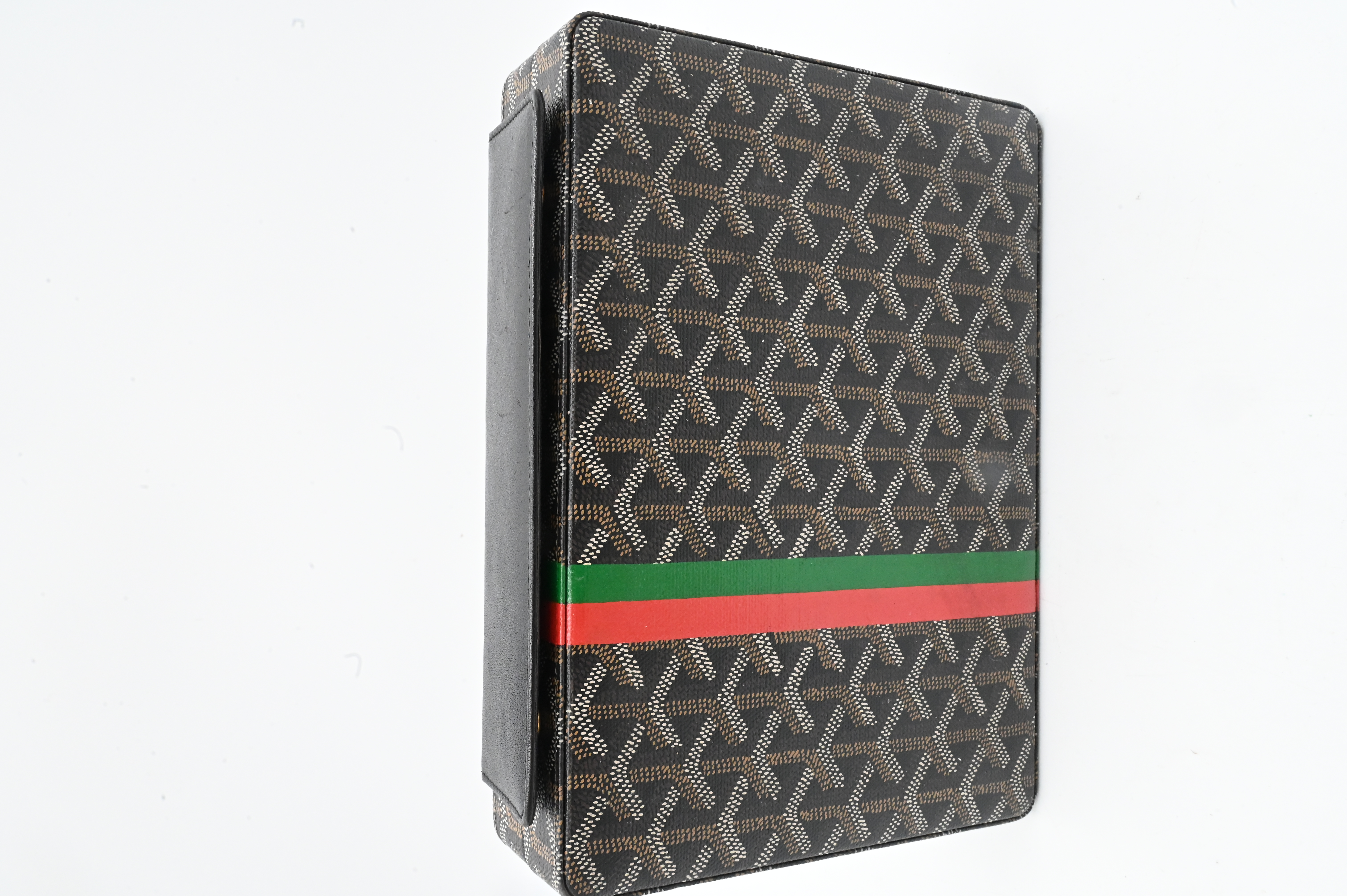 Custom Goyard Cigar Box, green and red stripe with initials S.L. marked, height 2 1/4 inches, width 9 3/8 inches.