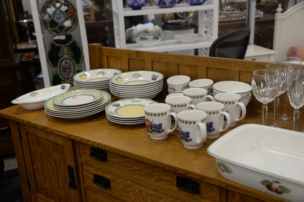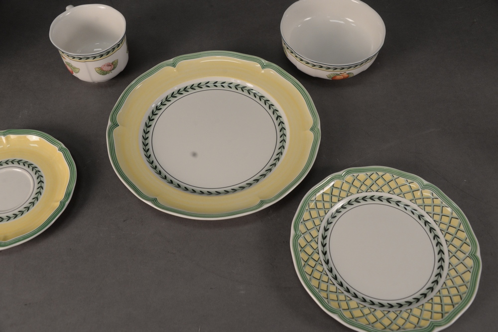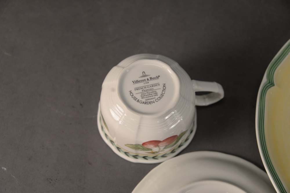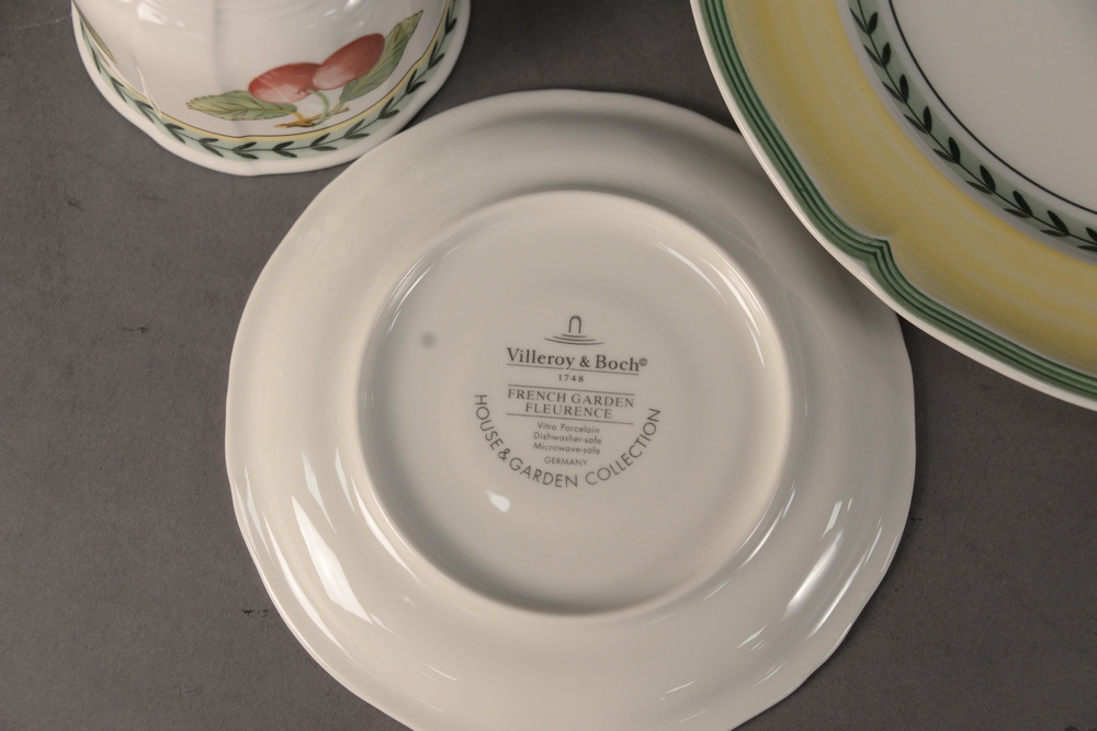 90 Pieces of Assorted Villeroy and Boch Dinnerware, to include 14 French Garden Vienne Dinner Plates, 8 French Garden Orange Salad Plates, 10 French Garden Fleurence Saucers, 9 tea cups, 6 coffee cups and several serving pieces, dinner plates diameter 10 1/2 inches, Provenance: David and Cynthia Kim, 22 Stoney Wylde Lane, Greenwich, Connecticut. View home by visiting: https://www.zillow.com/homedetails/22-Stoney-Wylde-Ln-Greenwich-CT-06830/177238281_zpid/.