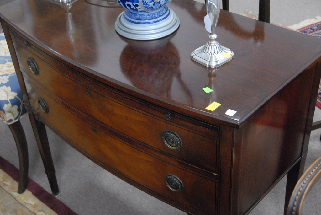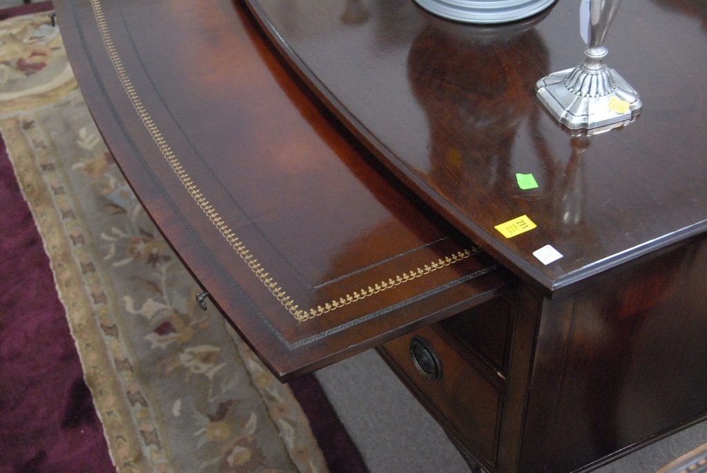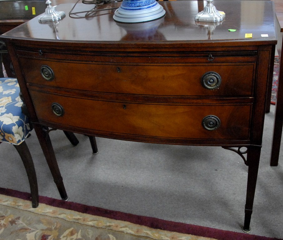 Lot 211: Beacon Hill custom mahogany server with pull-out slide with inset leather over two drawers on square tapered legs, signed with paper…