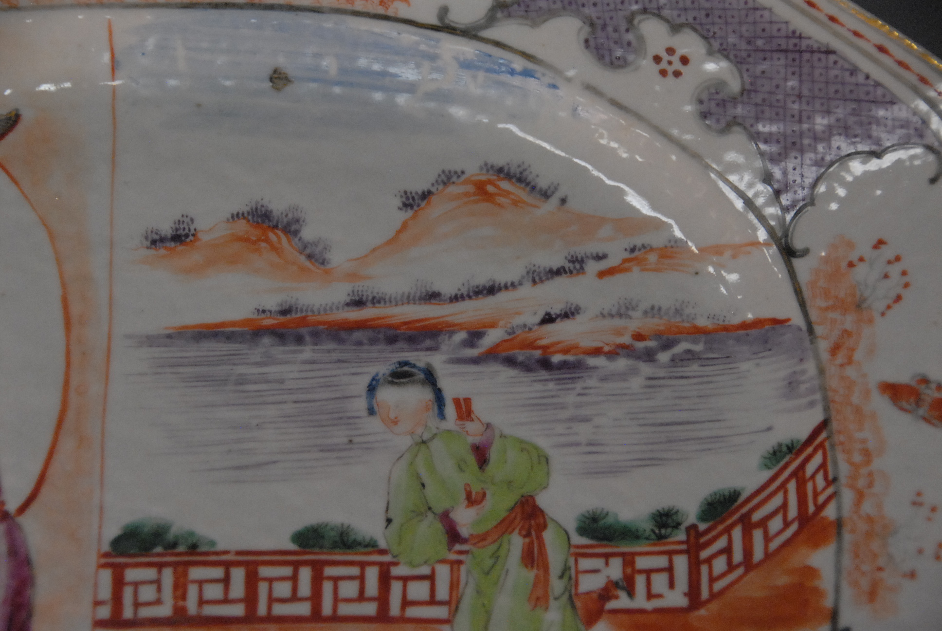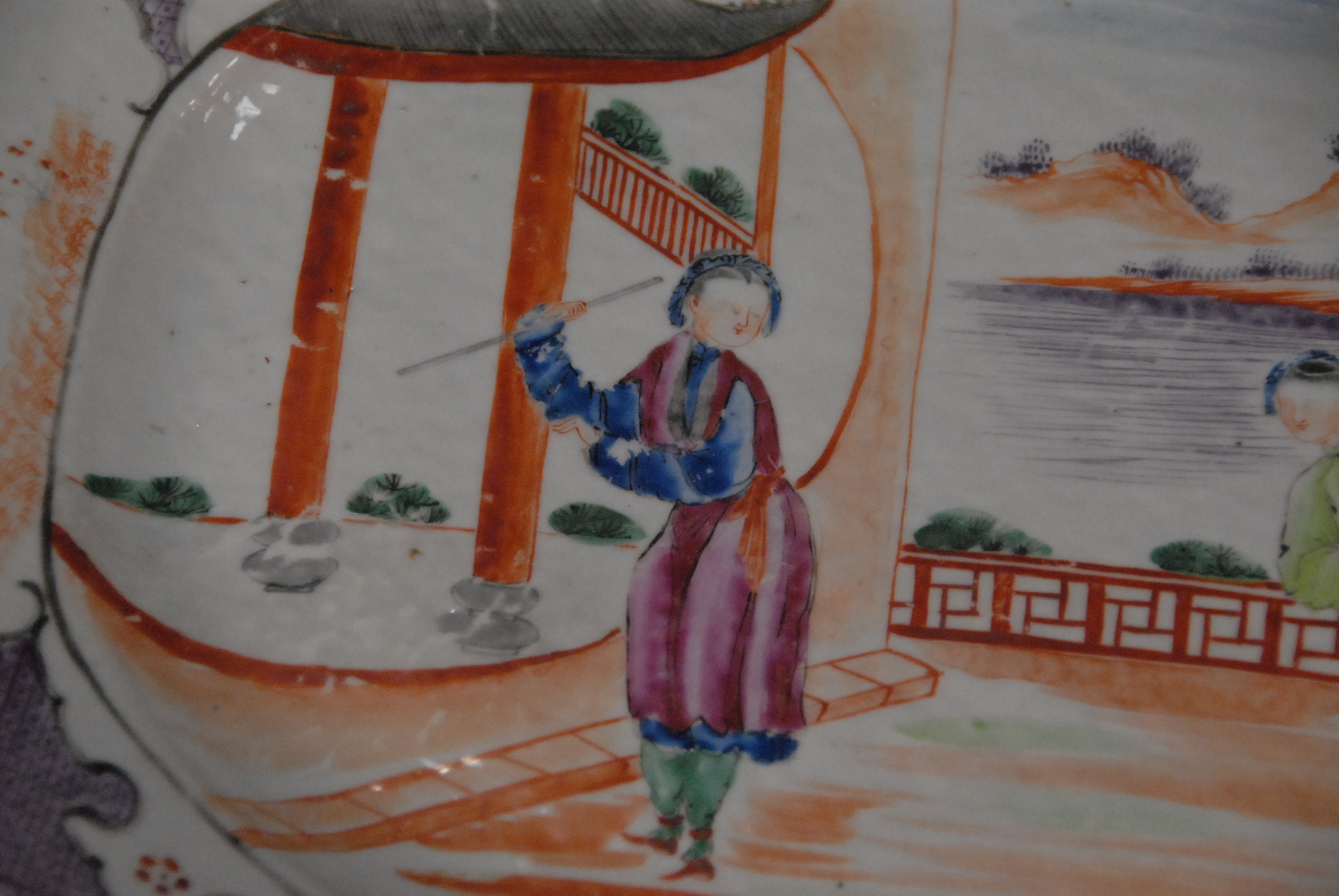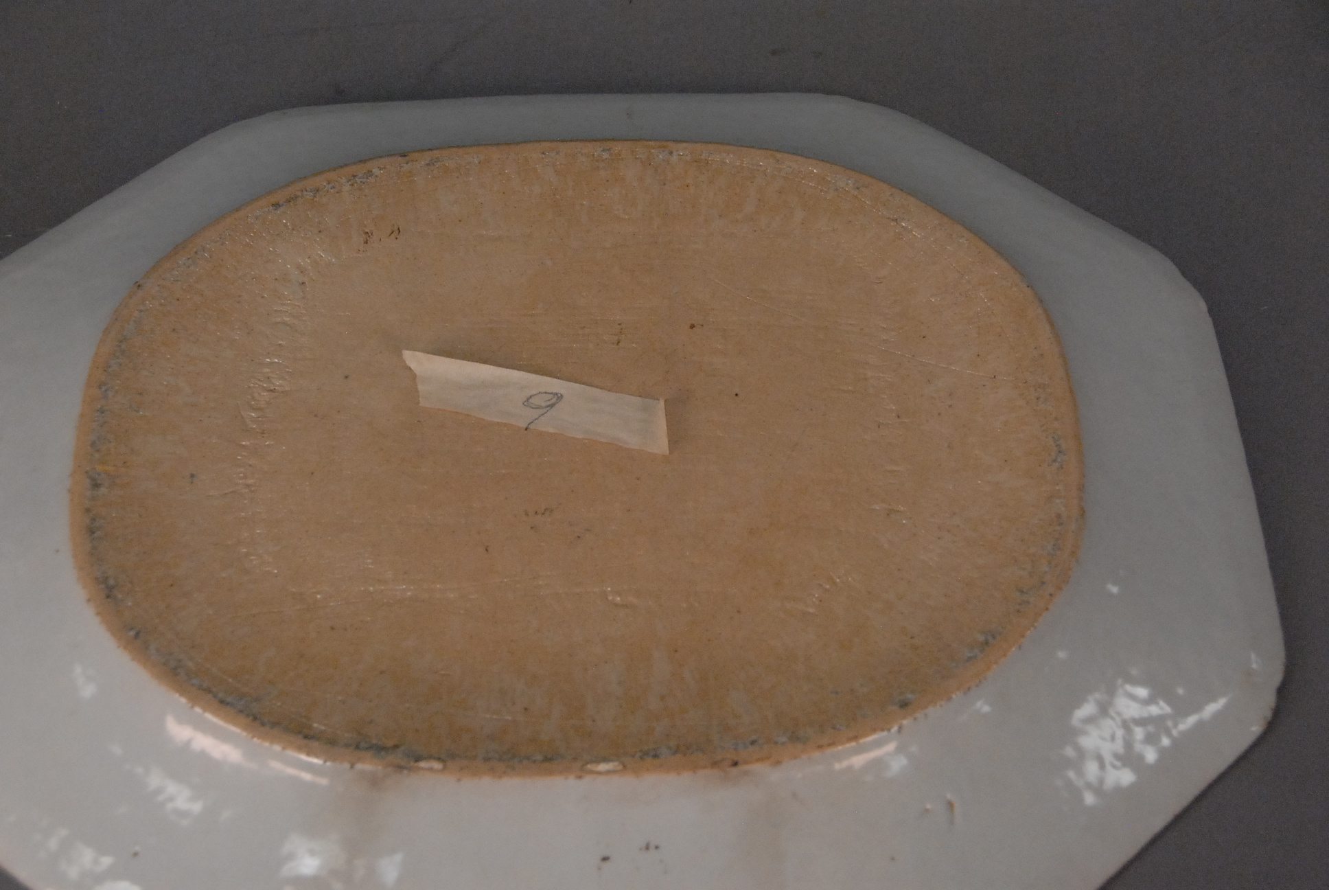 Lot 211: Chinese Export porcelain chamfered octagonal platter in tones of puce, iron-red, and chartreuse, late 19th century some overall wear. lg. 16in. wd. 13in.