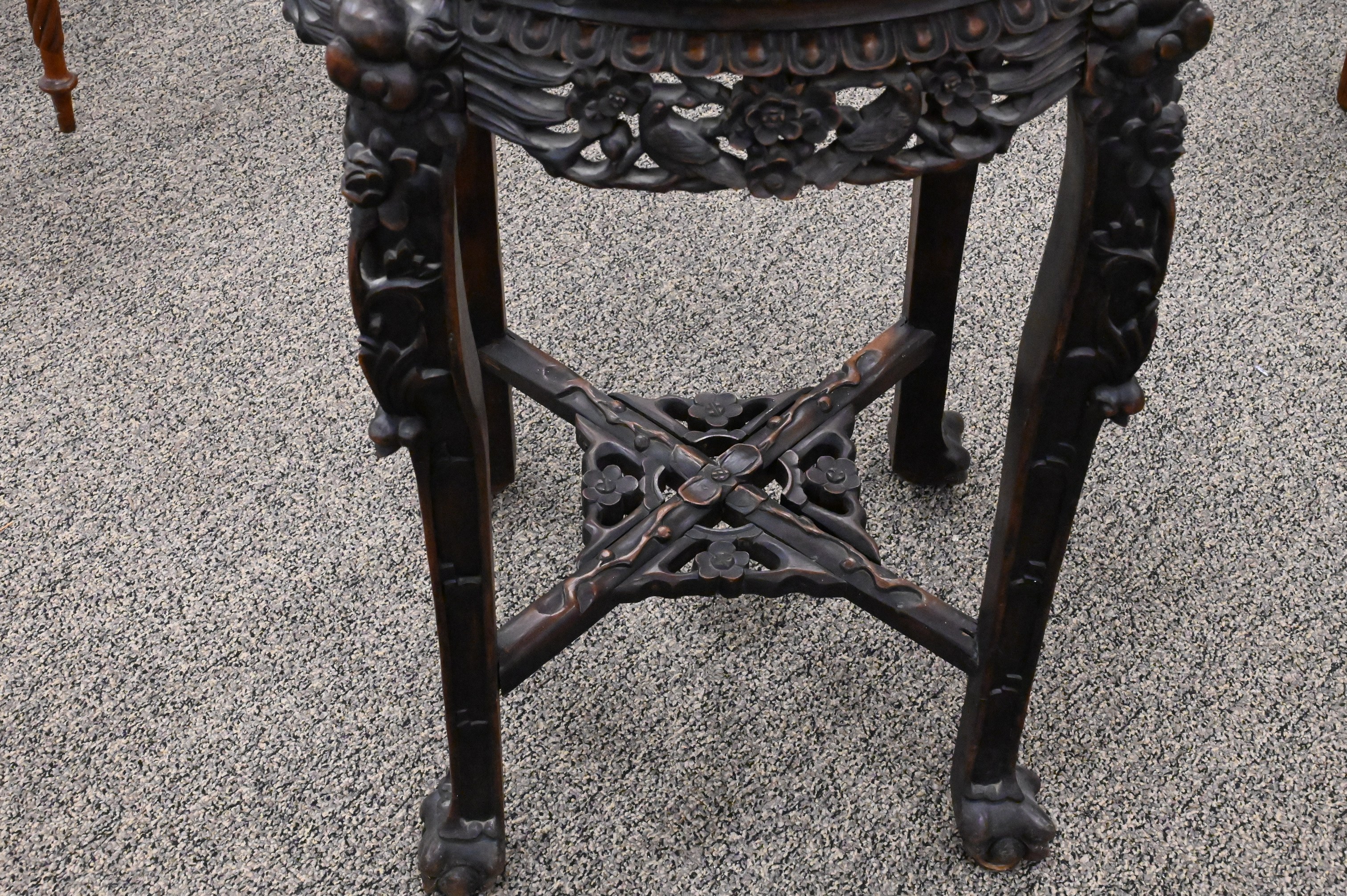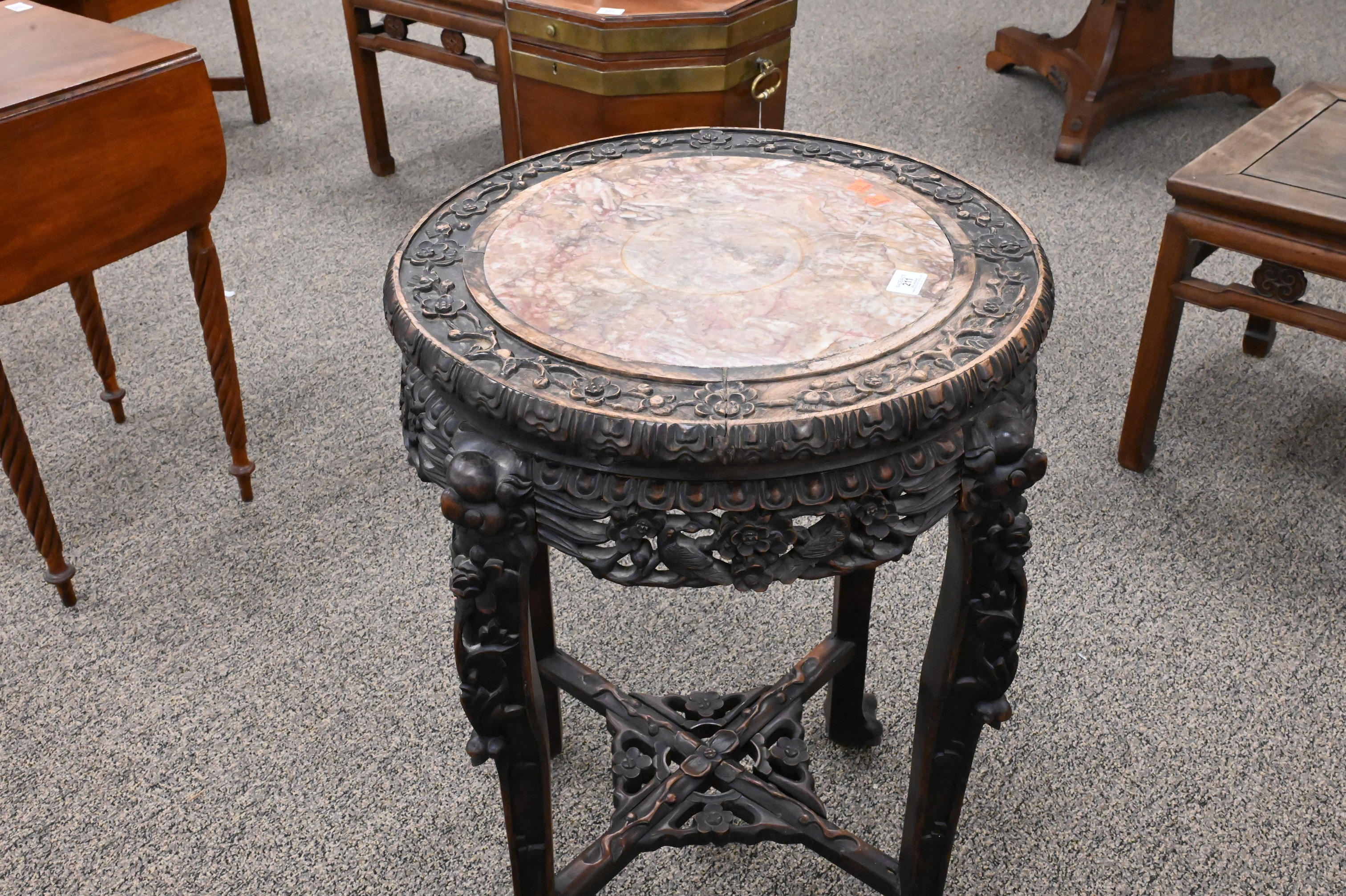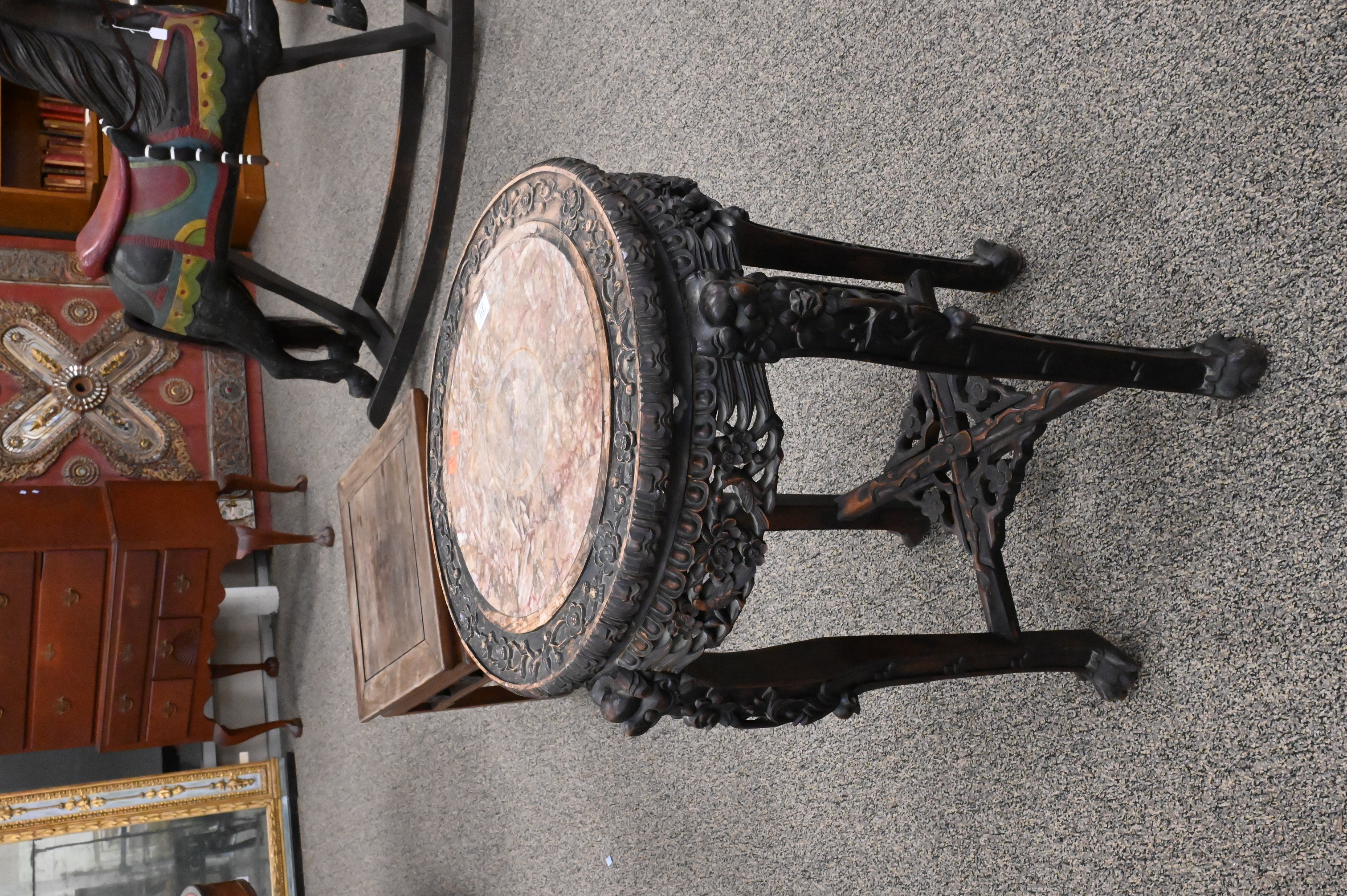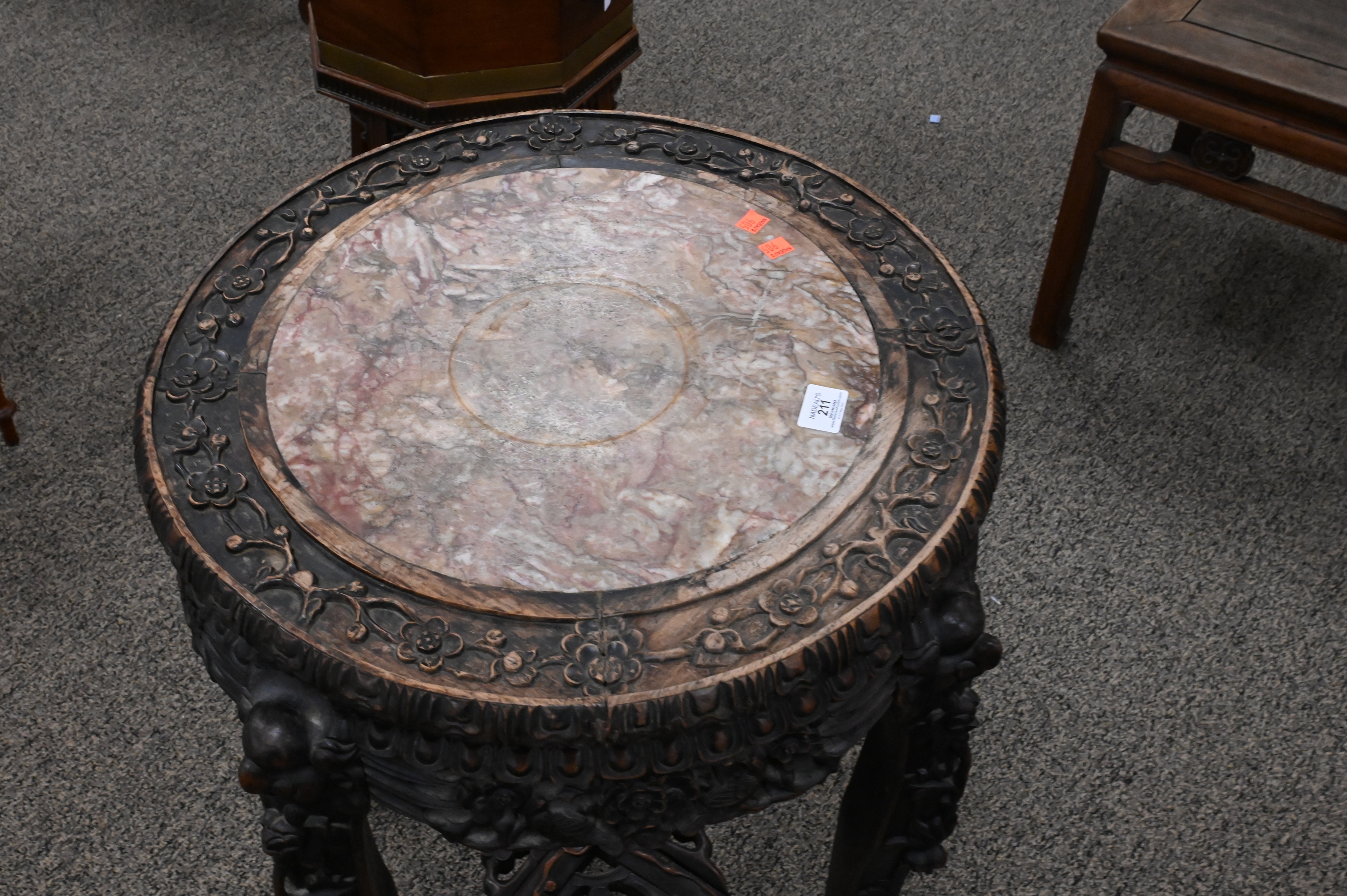 Lot 211: Chinese Teak Wood Carved Table having Rouge Inset Marble Top