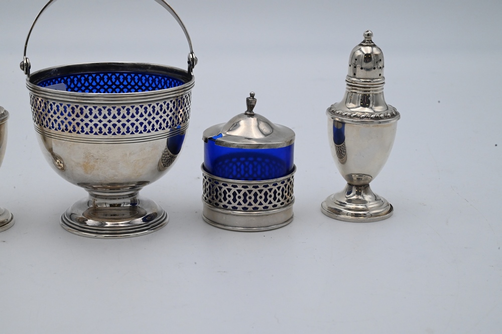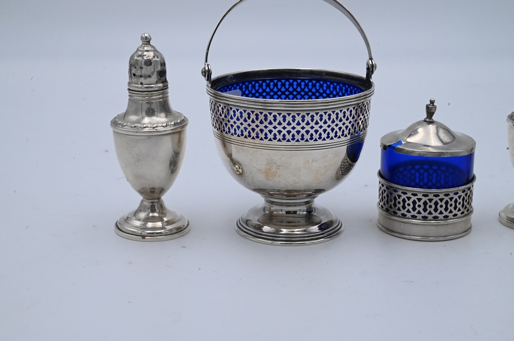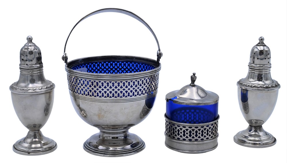Four Piece Sterling Silver Lot, to include Tiffany & Company sterling silver sugar bowl with cobalt liner, condiment cobalt liner, along with a pair of pepper shakers, height 4 1/4 inches.