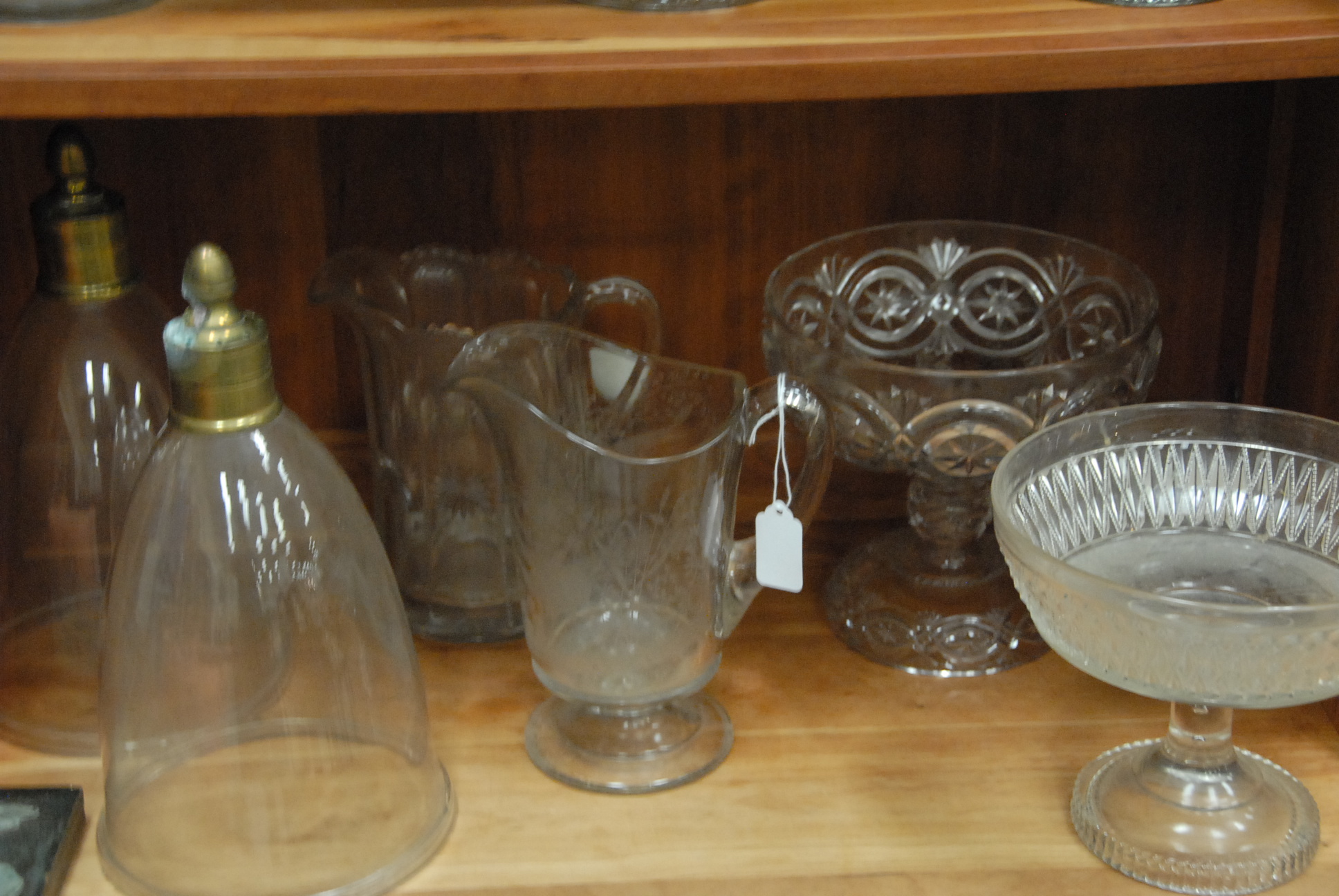 Fourteen piece grouping of Fostoria and Depression glass to include six compotes, four pitchers, crane flower frog, two brass mounted glass shades, etc.