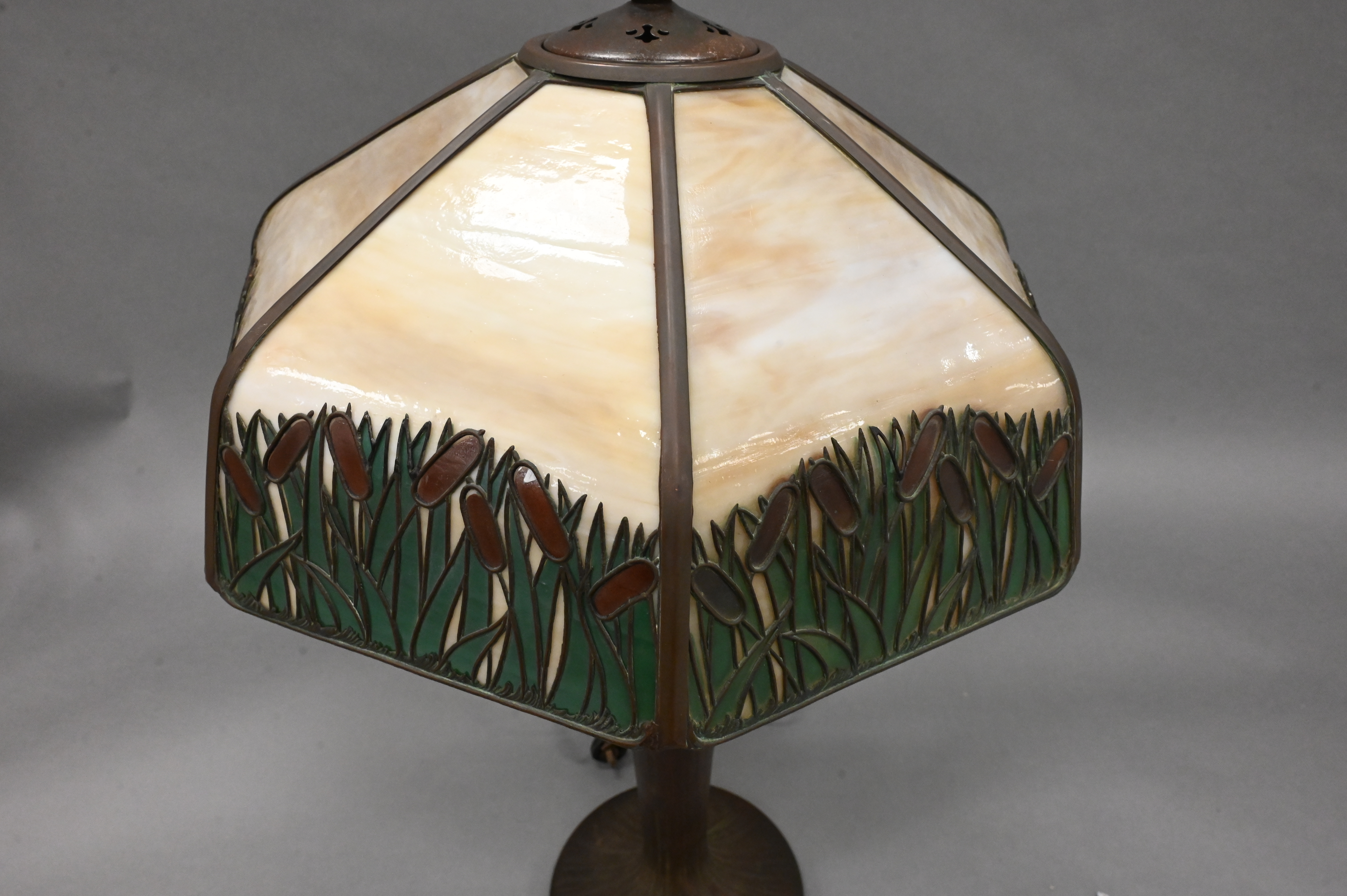 the square, gently domed shade executed in mottled opalescent glass, decorated with a continuous frieze of cattails and reeds in green, brown, and cream tones, each panel leaded and soldered; interior rim impressed HANDEL and PAT’D NO. 979664; raised on the original patinated bronze vase-form base with flared foot and original sockets.