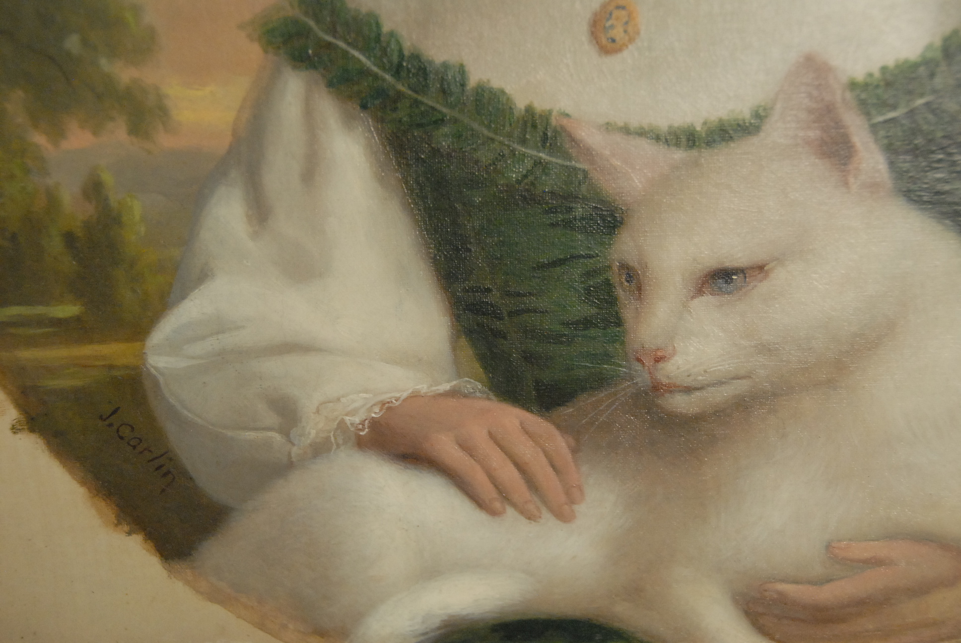 John Carlin 1813-1891 GIRL WITH CAT oil on canvas signed lower left J. Carlin restretched and relined 21 x 17