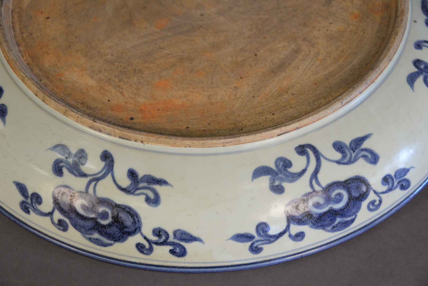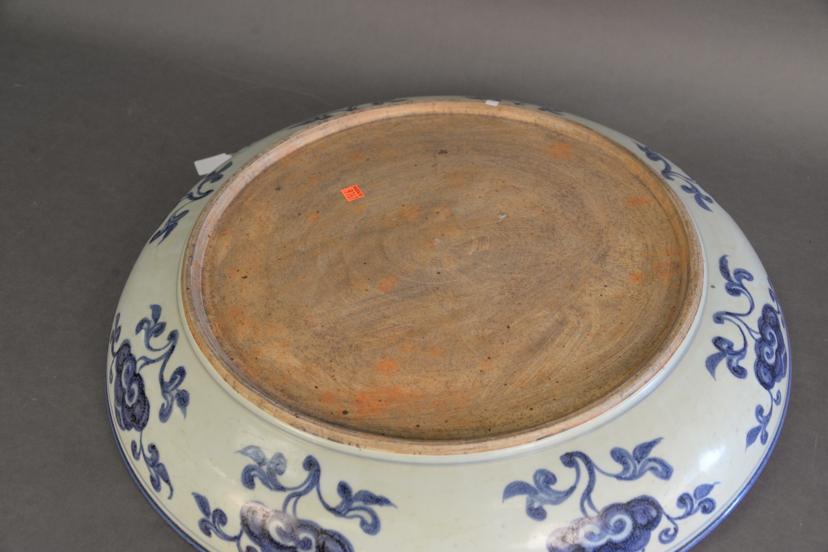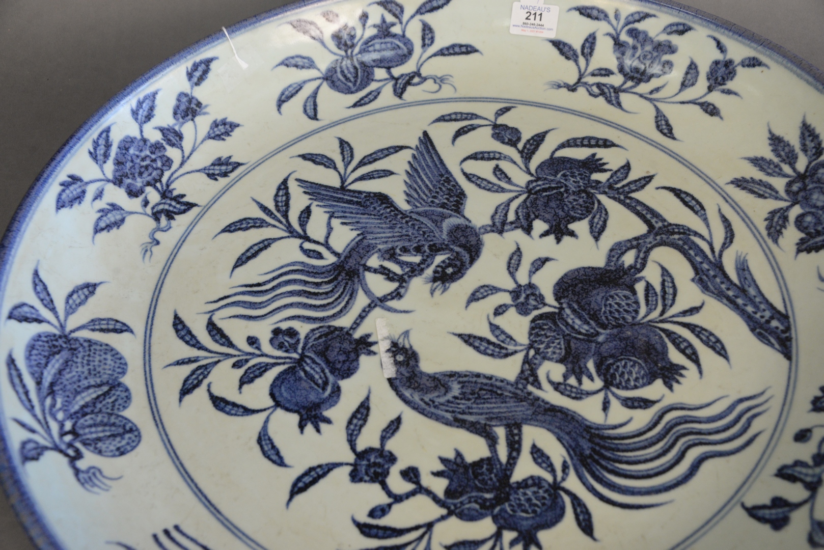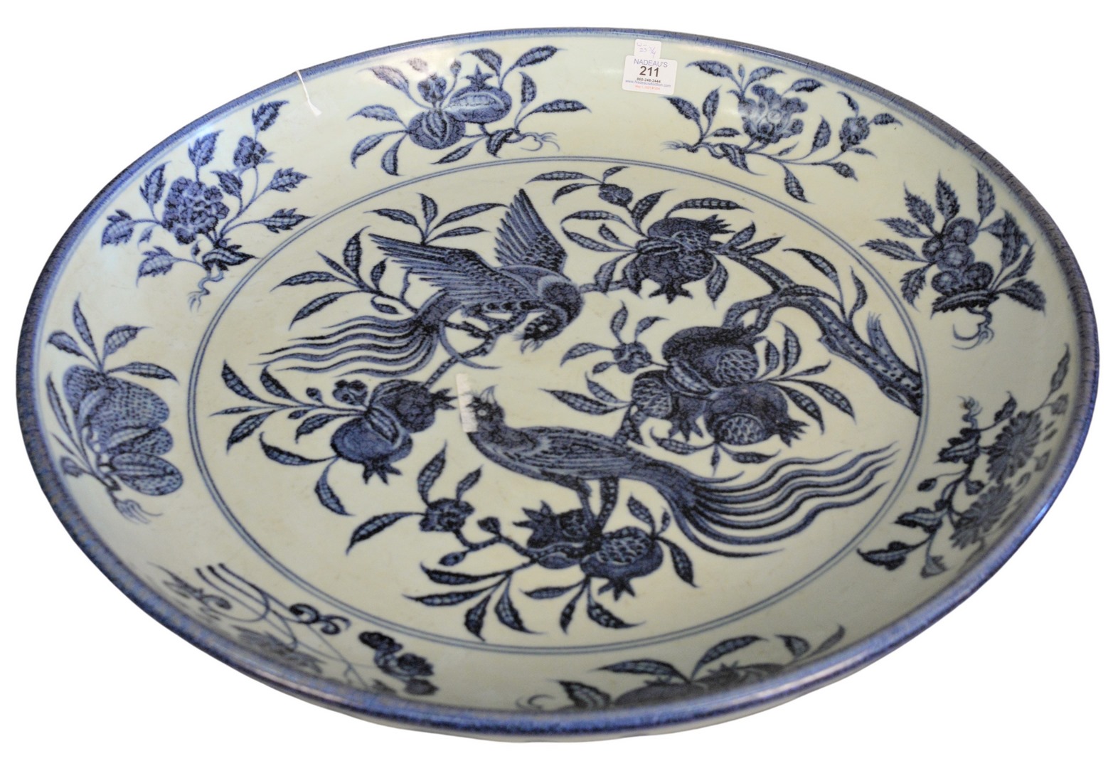 Lot 211: Large Chinese Ming Style Blue and White Porcelain charger with painted bird and pomegranate motif, diameter 23 5/8 inches.