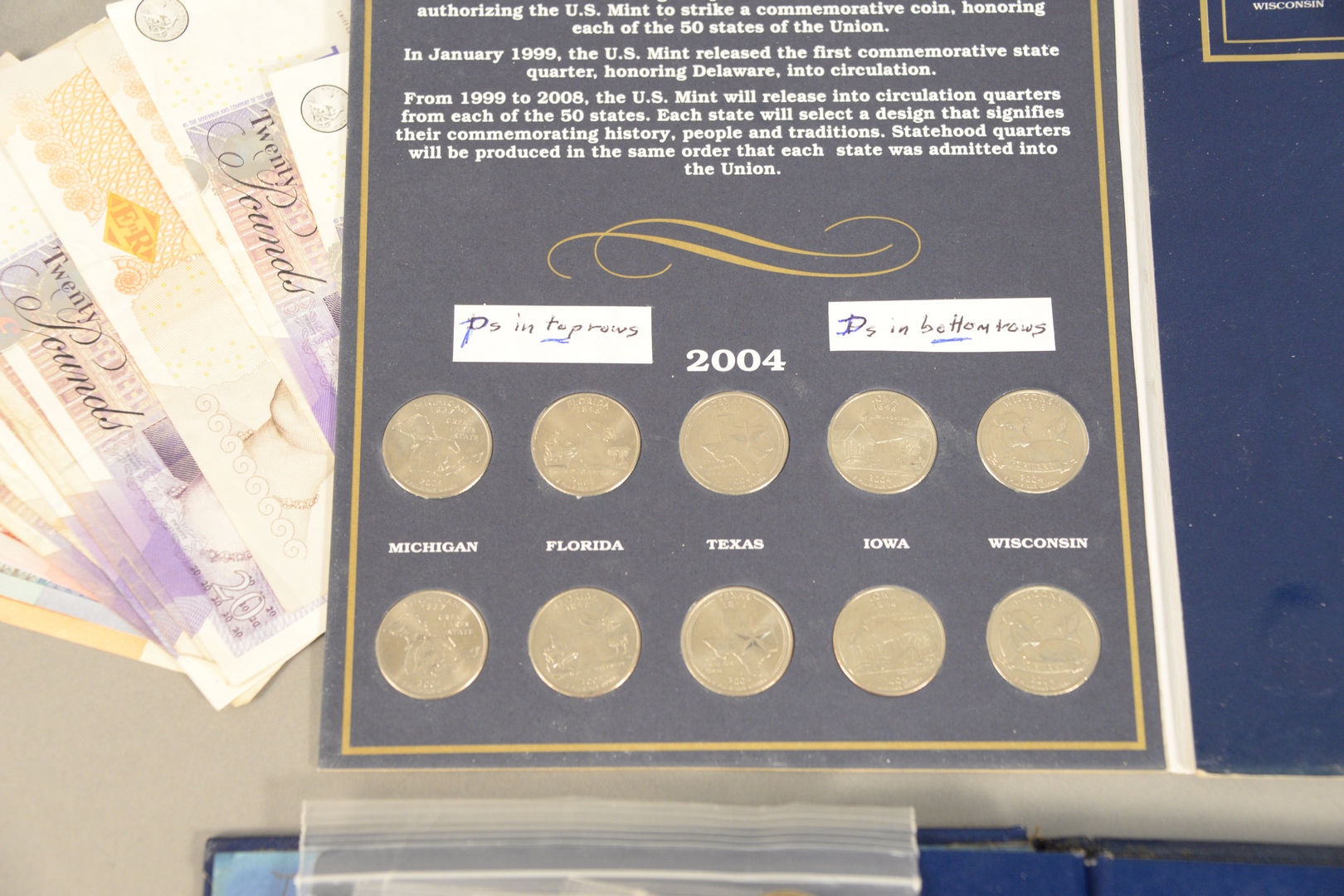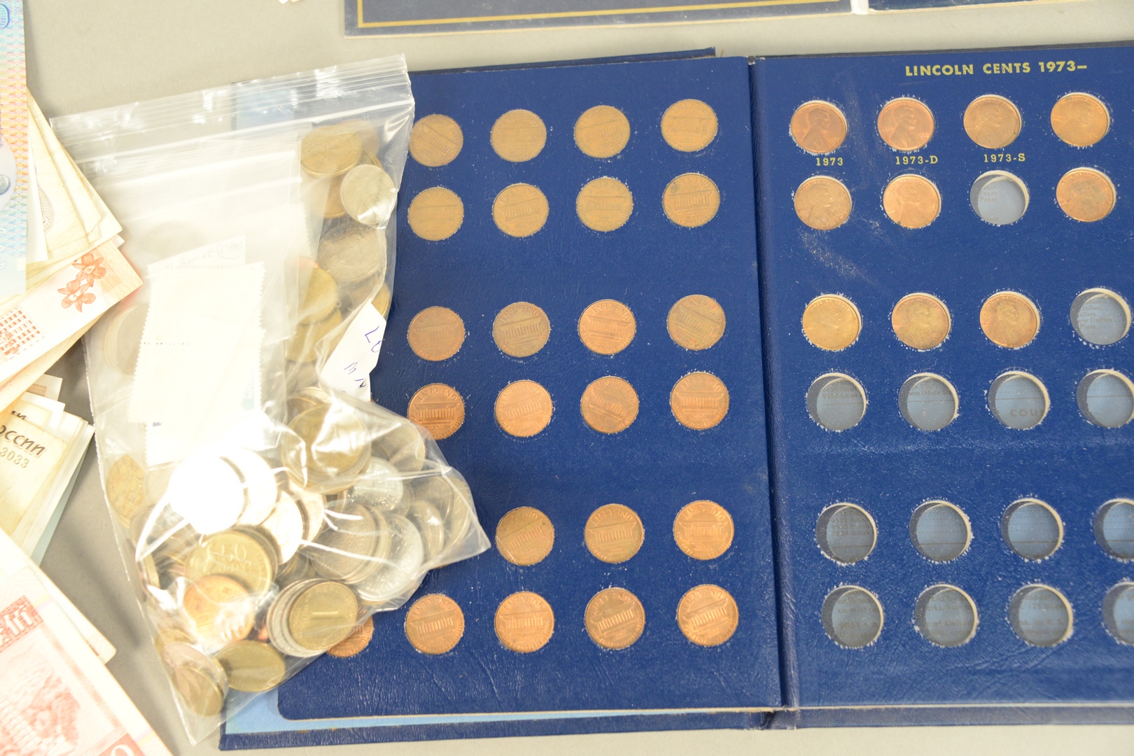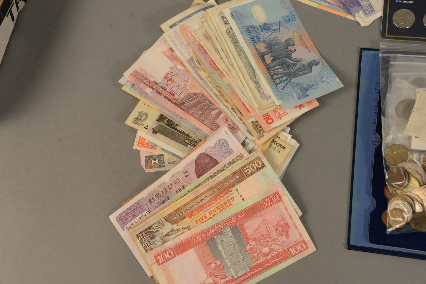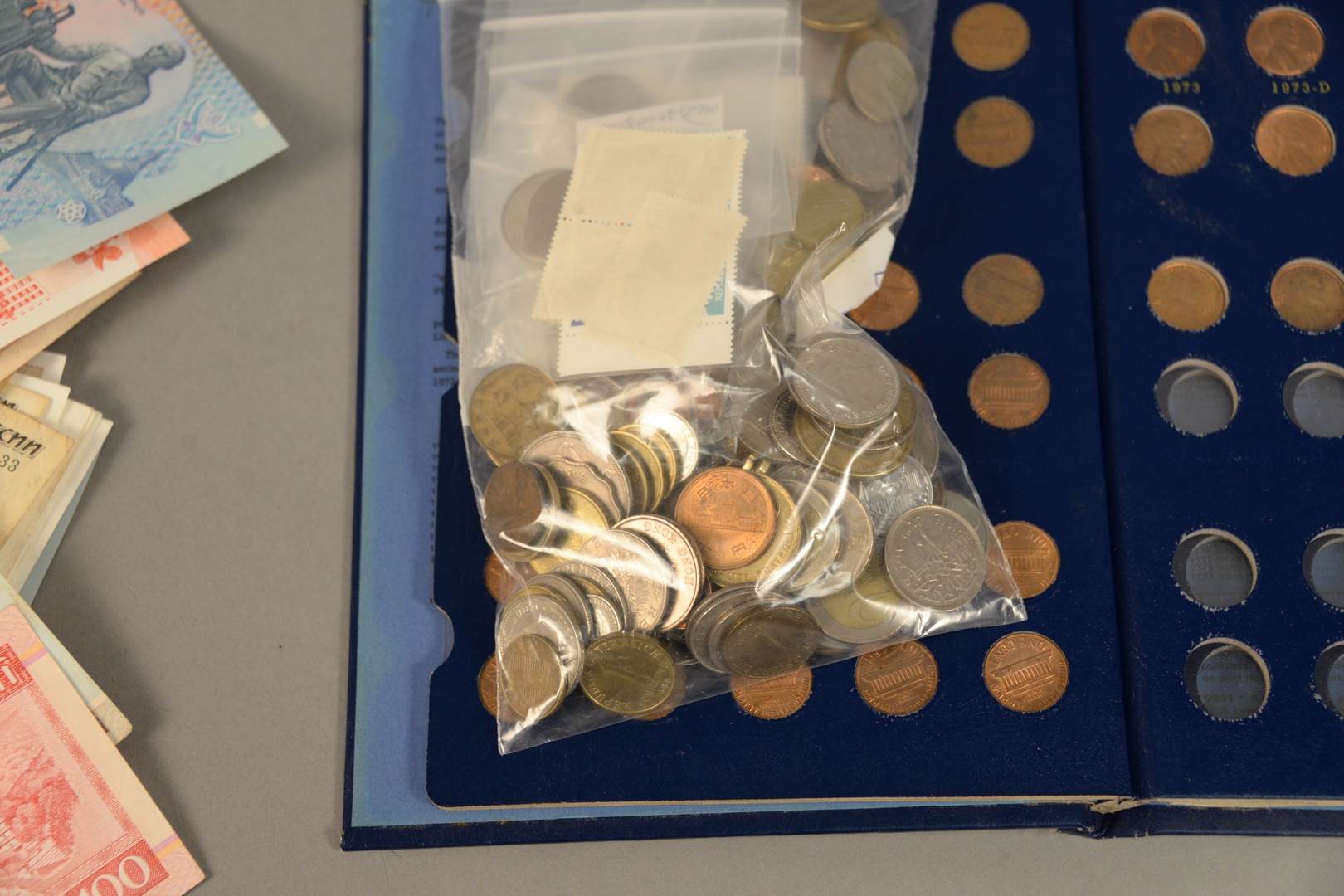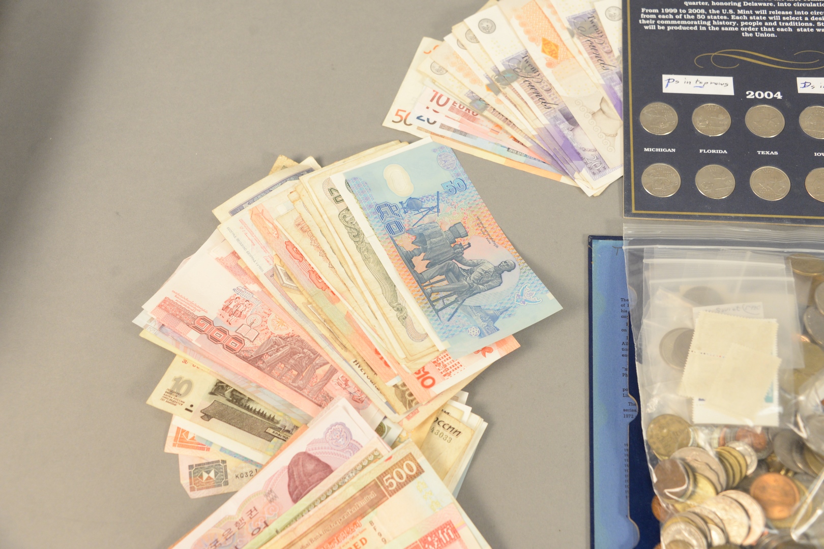 Large lot of foreign currency to include Nepal Korea Spain England India Australia Hong Kong Malaysia Vietnam Belgium Russia Indonesia Myanmar Italy Poland Singapore Ireland Romania mixed lot of foreign coins and a few stamps along with 1 – U.S. Commemorative quarter album and one U.S. cent album.