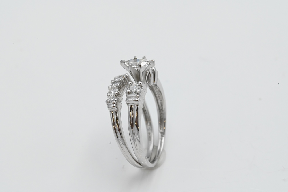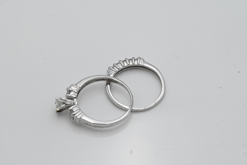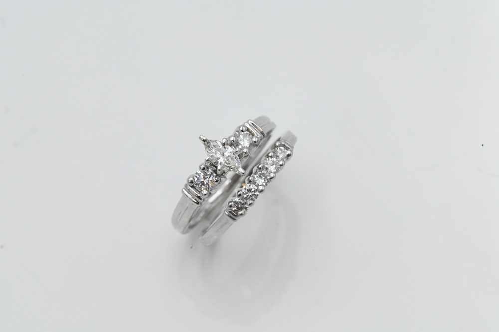 New Platinum and Diamond Two Ring Bridal Set, having center marquis diamond, flanked by diamonds, along with wedding band having five diamonds; size 7; 8 grams; new price $4,000.