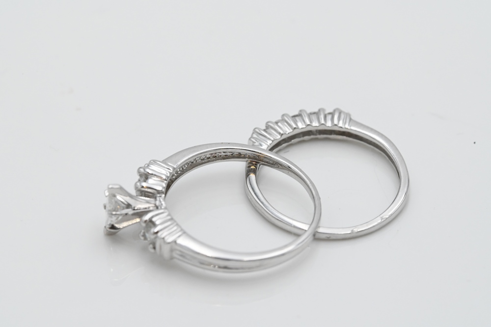Lot 211: New Platinum and Diamond Two Ring Bridal Set, having center marquis diamond, flanked by diamonds, along with wedding band having fiv…